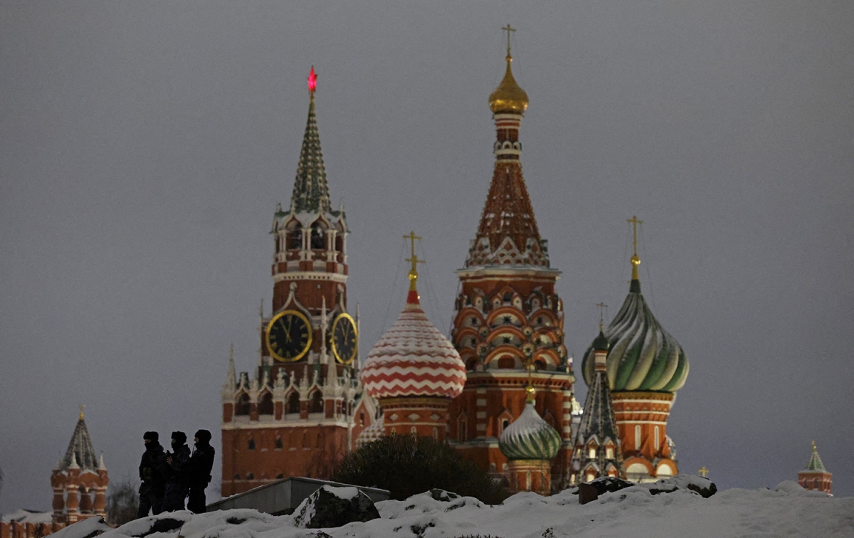 Lực lượng thực thi pháp luật đứng gác gần tháp Spasskaya của Điện Kremlin và Nhà thờ Thánh Basil trong lễ mừng Năm mới tại trung tâm Moscow, Nga, ngày 31/12/2025. Ảnh: Reuters.