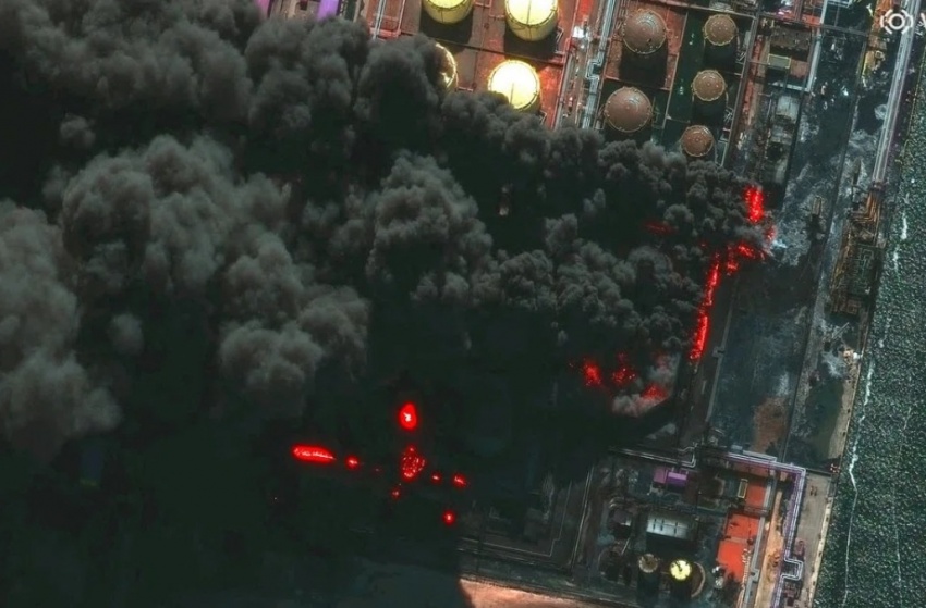 Hình ảnh vệ tinh cho thấy khói bốc lên từ cảng Ust-Luga thuộc vùng Baltic của Nga sau một cuộc tấn công của Ukraine, tỉnh Leningrad, ngày 27/3/2026.