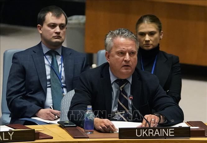 Ông Sergiy Kyslytsya (phía trước) phát biểu trong phiên họp Hội đồng Bảo an LHQ ở New York, Mỹ năm 2023. Ảnh tư liệu: AFP/TTXVN
