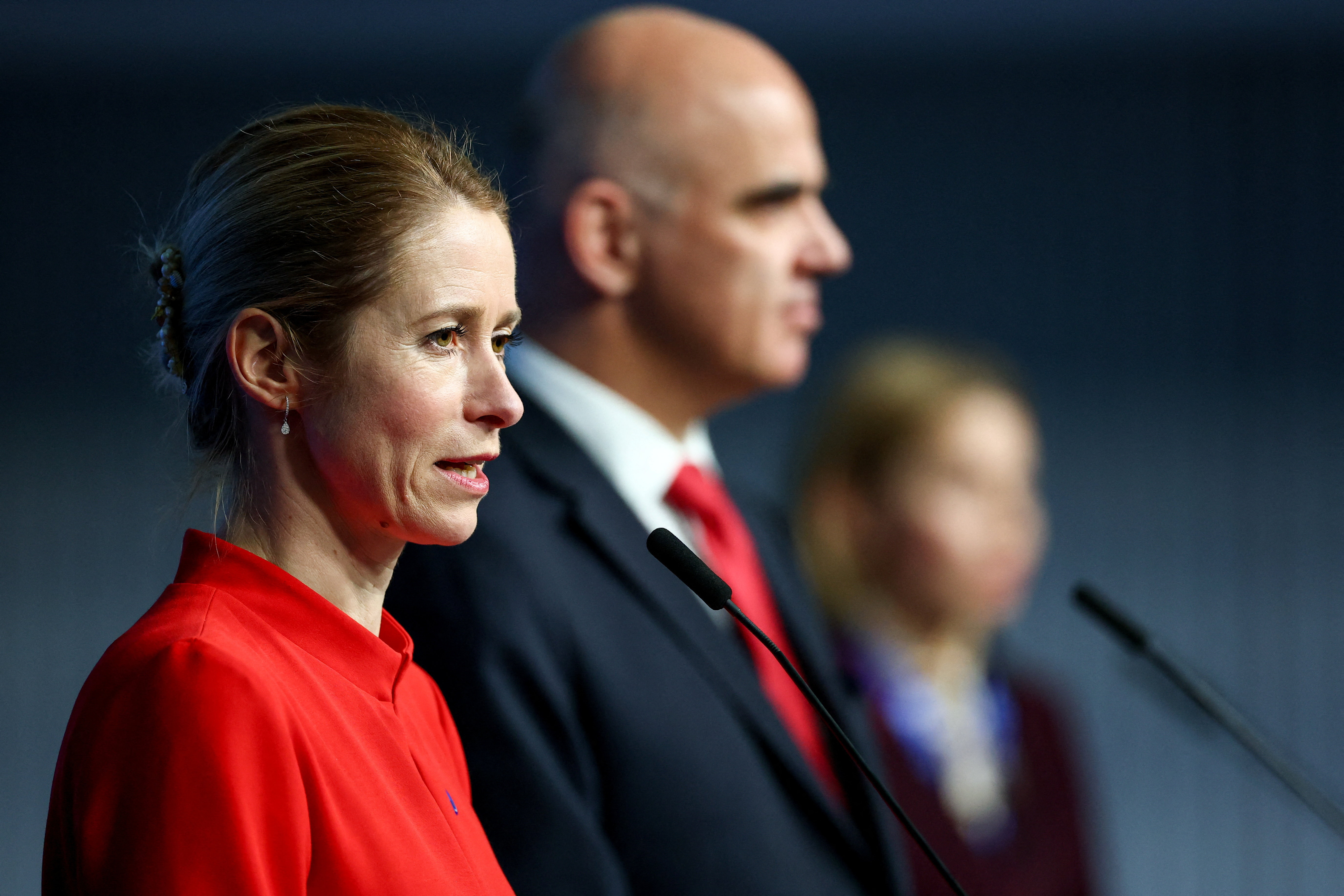 Đại diện Cấp cao của Liên minh châu Âu về Chính sách Đối ngoại và An ninh, Phó Chủ tịch Ủy ban châu Âu Kaja Kallas, cùng Tổng Thư ký Hội đồng châu Âu Alain Berset tham dự cuộc họp báo sau lễ ký hiệp ước thành lập Ủy ban Khiếu nại Quốc tế về Ukraine. (Ảnh: REUTERS/Piroschka van de Wouw)