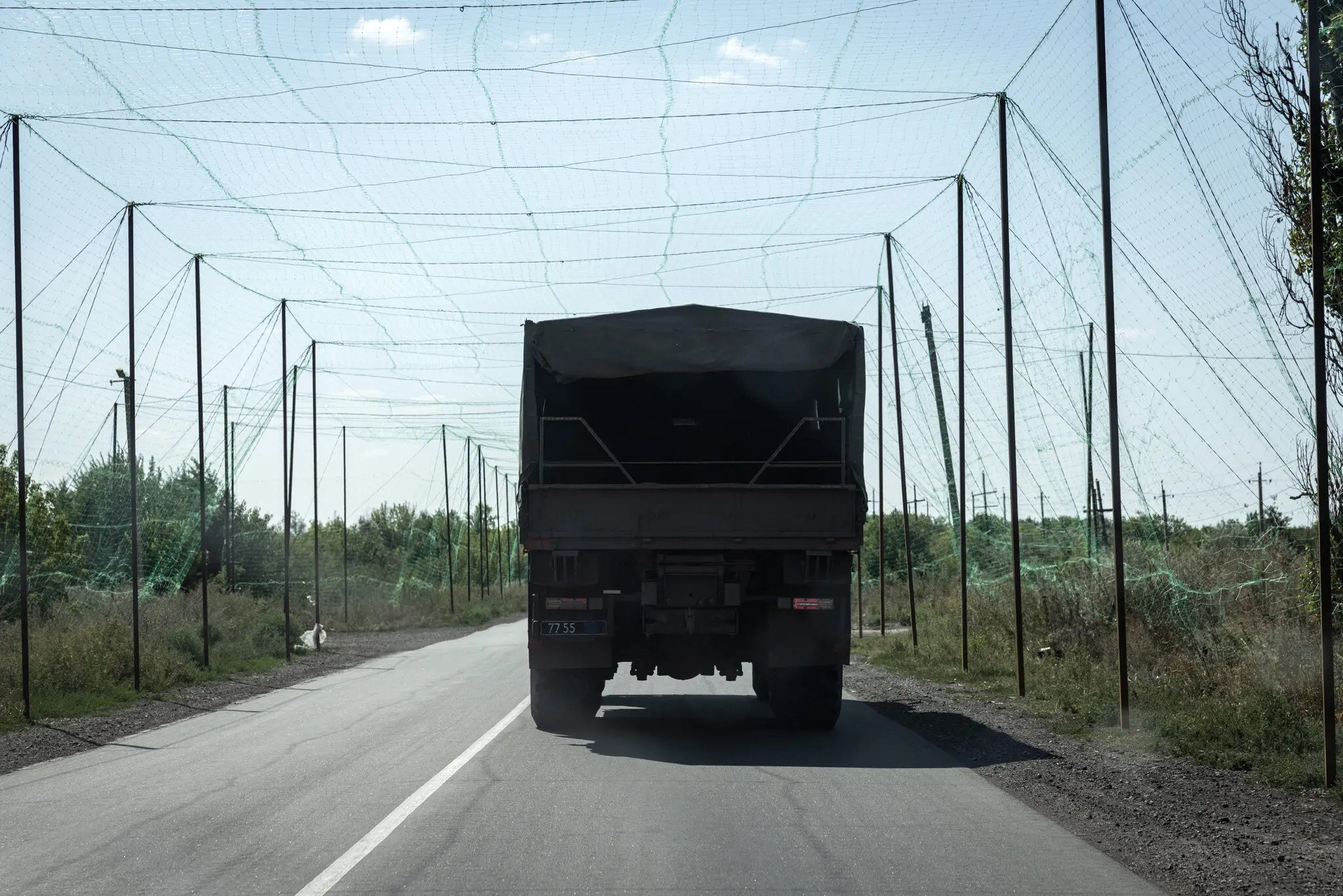 Một phương tiện quân sự Ukraine di chuyển dưới hệ thống lưới ngụy trang nhằm bảo vệ trước các đòn tấn công bằng UAV, gần thành phố tiền tuyến Pokrovsk. (Ảnh: Finbarr O’Reilly/The New York Times)