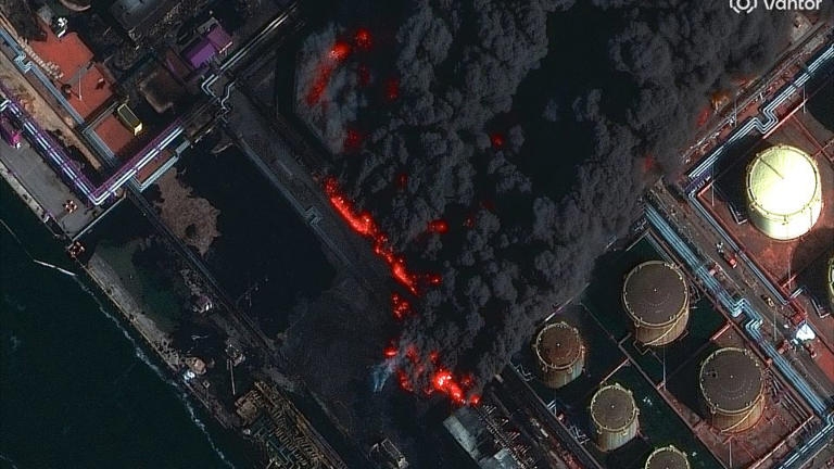 Ảnh chụp từ vệ tinh cho thấy một cơ sở dầu mỏ của Nga bị bốc cháy sau cuộc tấn công của Ukraine. Ảnh: AP