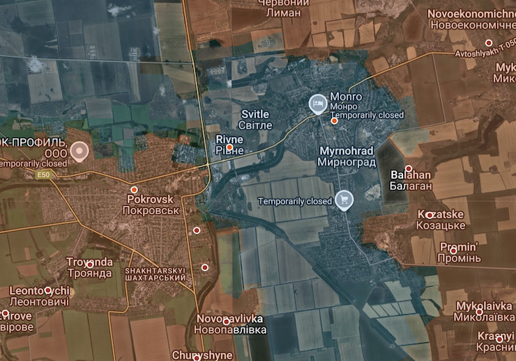 Trong khi Nga sắp hoàn tất kiểm soát Pokrovsk, vòng vây ở thành phố Myrnohrad lân cận ngày càng khép lại. Ảnh: Suriyak/X.