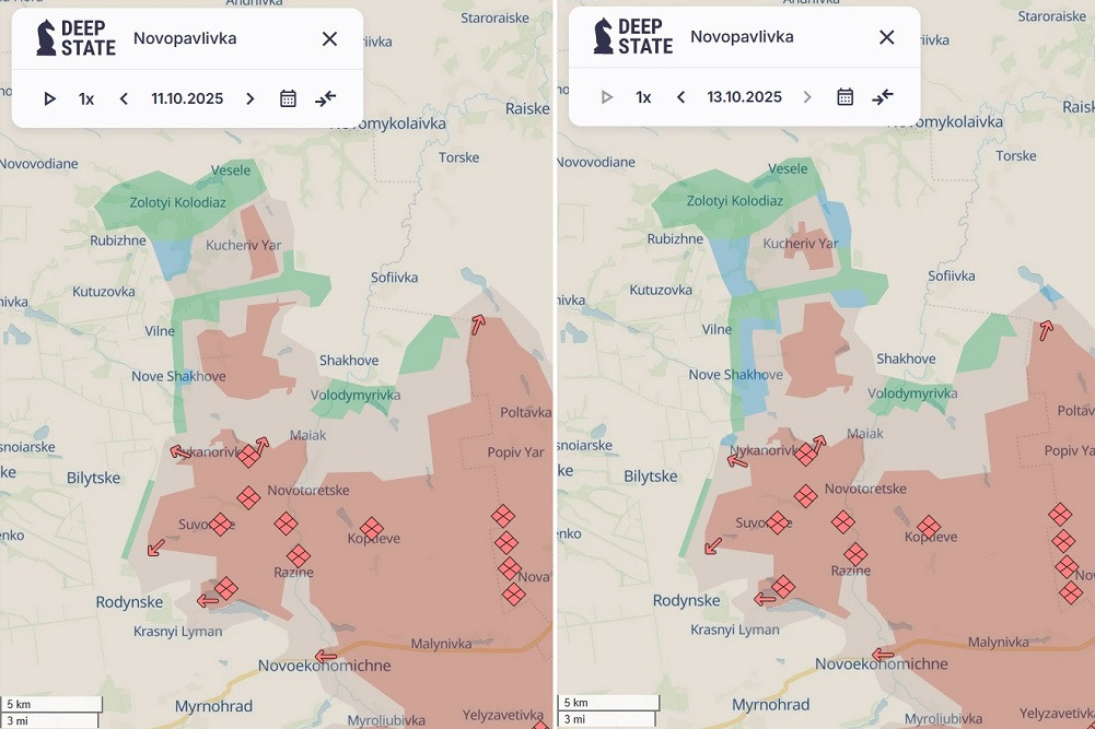 Theo bản đồ cập nhật tình hình chiến sự ở khu vực phía bắc mặt trận Pokrovsk, vùng xanh, tức nơi các đơn vị phòng thủ Ukraine đang nắm quyền kiểm soát, đã mở rộng hơn trong khoảng thời gian từ ngày 11-13/10.