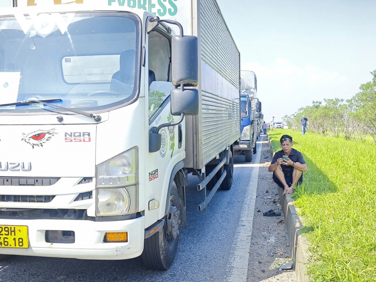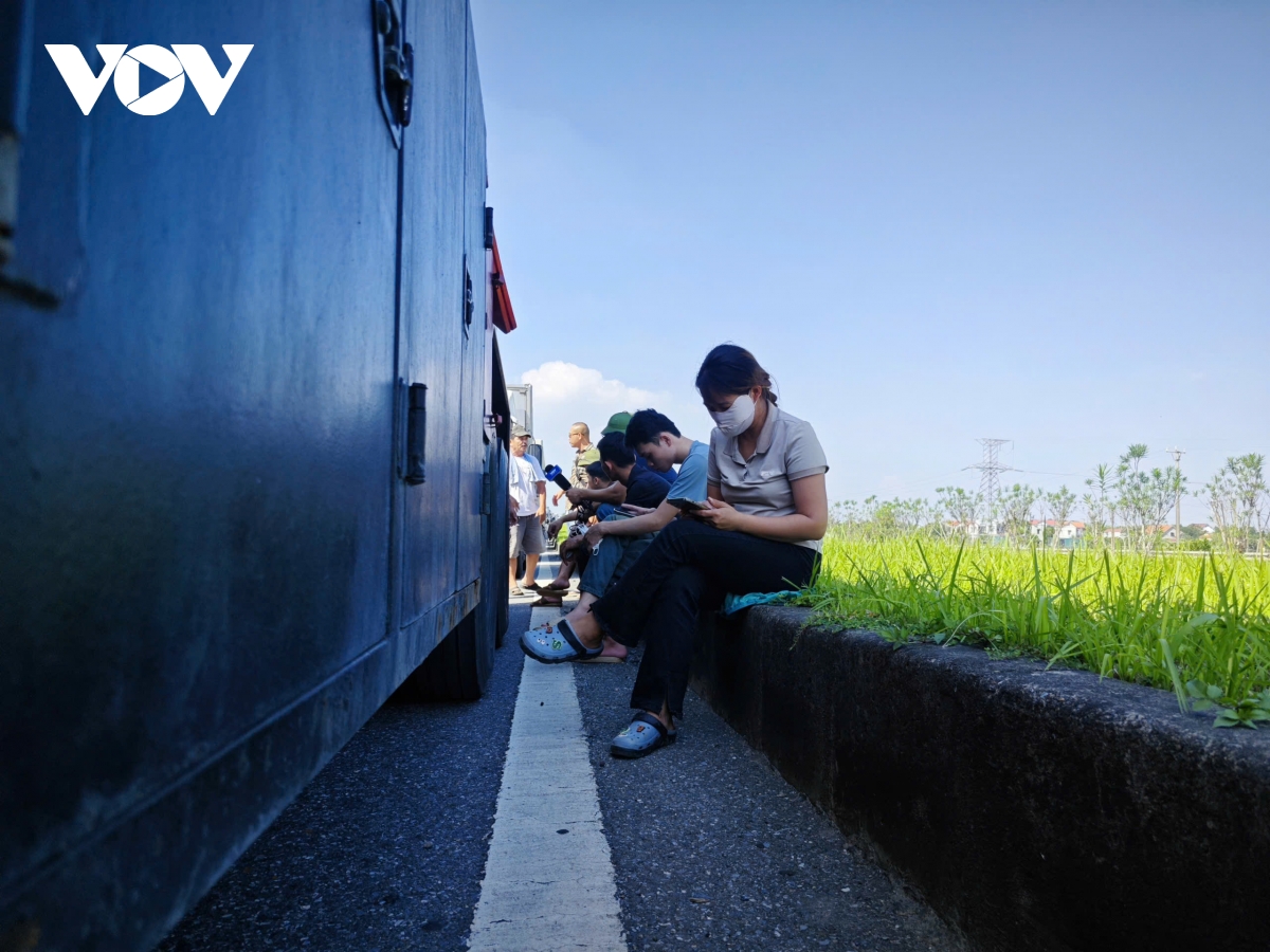 Trong dòng xe ùn ứ chờ các phương tiện phía trước, nhiều tài xế ô tô, hành khách sốt ruột xuống xe ngồi dưới vỉa hè chờ đến lúc thông xe