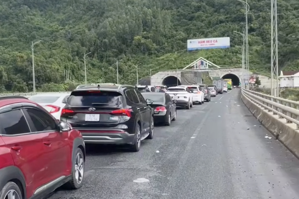 Các phương tiện nối đuôi qua hầm Đèo Cả. Ảnh: HOÀNG SAO