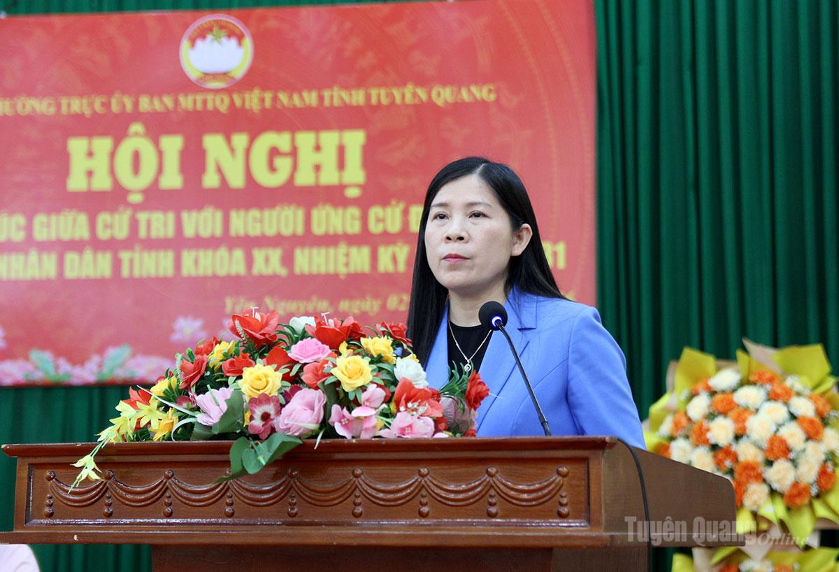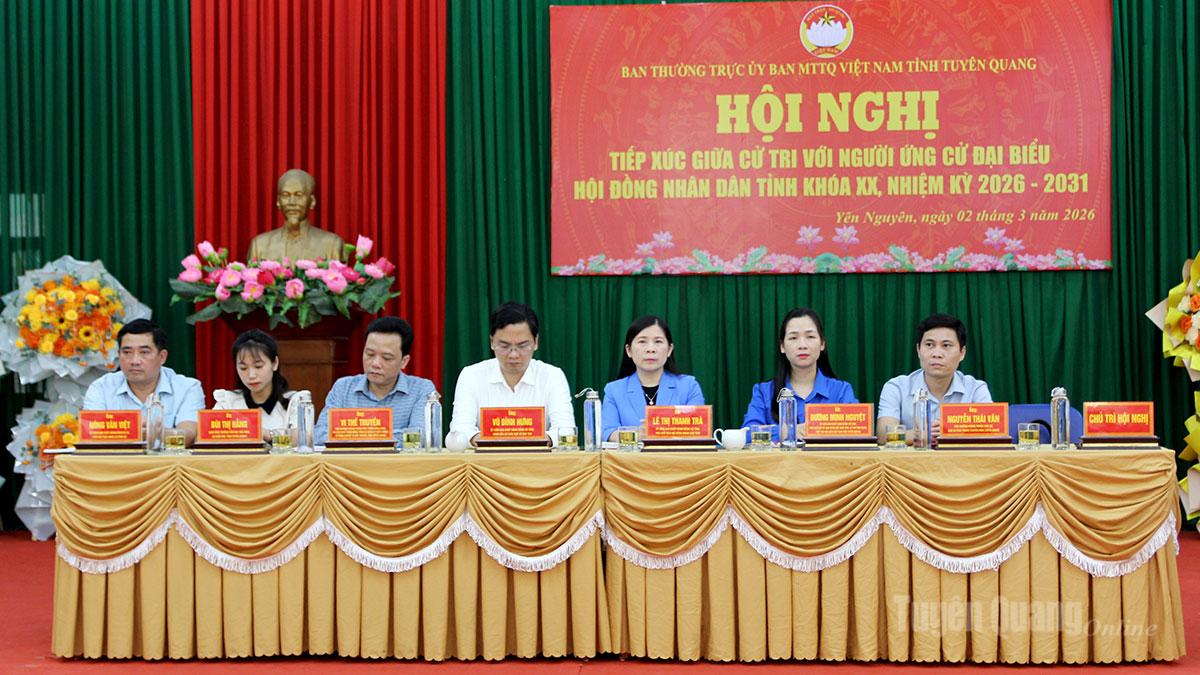 Chiều 2-3, ứng cử viên đại biểu HĐND tỉnh đơn vị bầu cử số 4 tiếp xúc cử tri vận động bầu cử tại xã Yên Nguyên. Dự hội nghị có các đồng chí: Lê Thị Thanh Trà, Ủy viên BCH Đảng bộ tỉnh, Phó Chủ tịch HĐND tỉnh; Vũ Đình Hưng, Ủy viên BCH Đảng bộ tỉnh, Giám đốc Sở Giáo dục và Đào tạo; Dương Minh Nguyệt, Ủy viên BCH Đảng bộ tỉnh, Phó Chủ tịch Ủy ban MTTQ Việt Nam tỉnh, Bí thư Tỉnh đoàn; các đồng chí ứng cử viên đại biểu HĐND tỉnh khóa XX, đơn vị bầu cử số 4. Hội nghị do Ban Thường trực Ủy ban MTTQ Việt Nam tỉnh Tuyên Quang tổ chức.