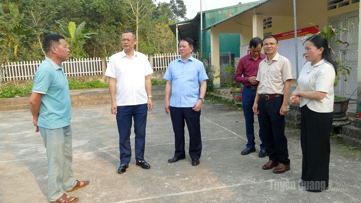 Đồng chí Trần Mạnh Lợi, Trưởng Ban Tuyên giáo và Dân vận Tỉnh ủy kiểm tra, trao đổi với cán bộ thôn 3, xã Quang Bình về công tác chuẩn bị bầu cử.