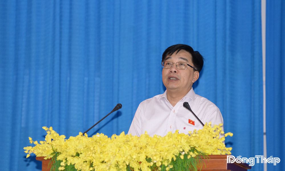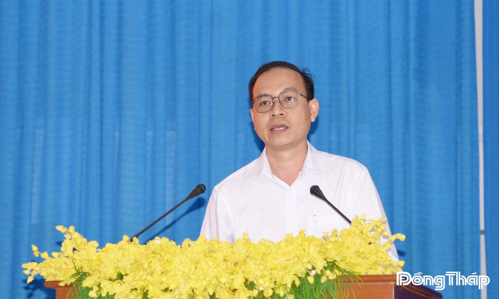 Ứng cử viên Tạ Minh Tâm, Phó Trưởng Đoàn chuyên trách Đoàn Đại biểu Quốc hội tỉnh Đồng Tháp khóa XV trình bày chương trình hành động tại hội nghị.