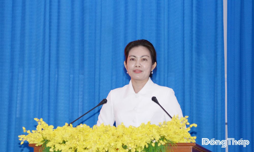 Ứng cử viên Nguyễn Thị Uyên Trang, Giám đốc Sở Văn hóa, Thể thao và Du lịch tỉnh Đồng Tháp, Ủy viên Ủy ban Văn hóa và Xã hội của Quốc hội khóa XV trình bày chương trình hành động tại hội nghị.