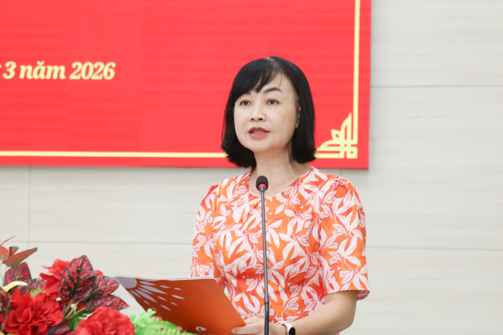 Ứng cử viên Lê Thị Kiều Oanh trình bày chương trình hành động tại buổi tiếp xúc cử tri