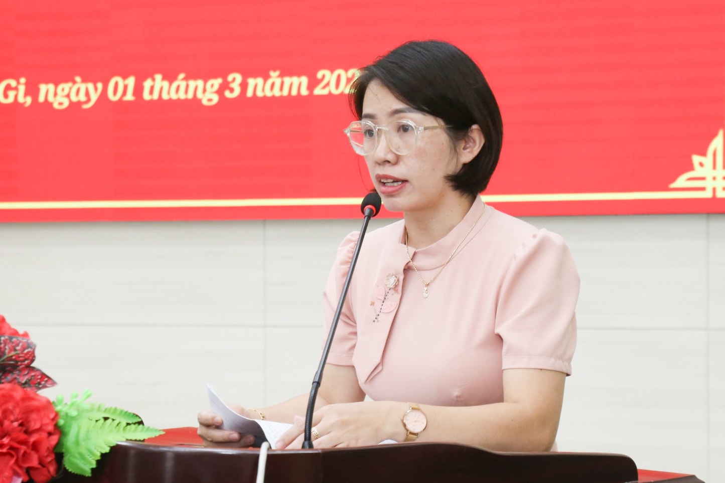 Ứng cử viên Phạm Thị Hồng Yến trình bày chương trình hành động tại buổi tiếp xúc cử tri