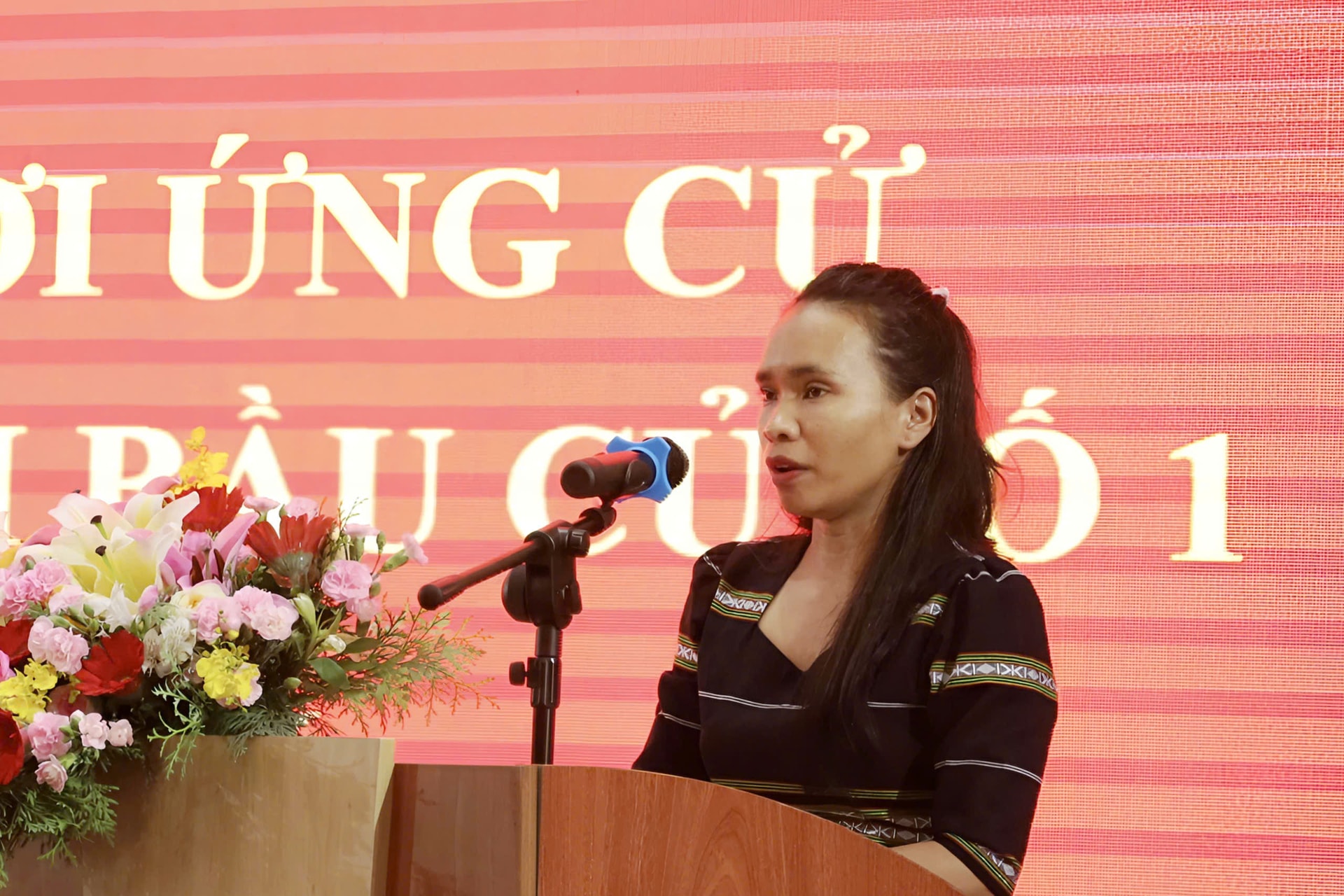Bà Kơ Să K’Xuân, Phó Bí thư Chi bộ Khoa Điều trị, Bác sĩ phụ trách Khoa Nội - Nhi - Truyền nhiễm, Trung tâm Y tế khu vực Lạc Dương trình bày chương trình hành động trước cử tri