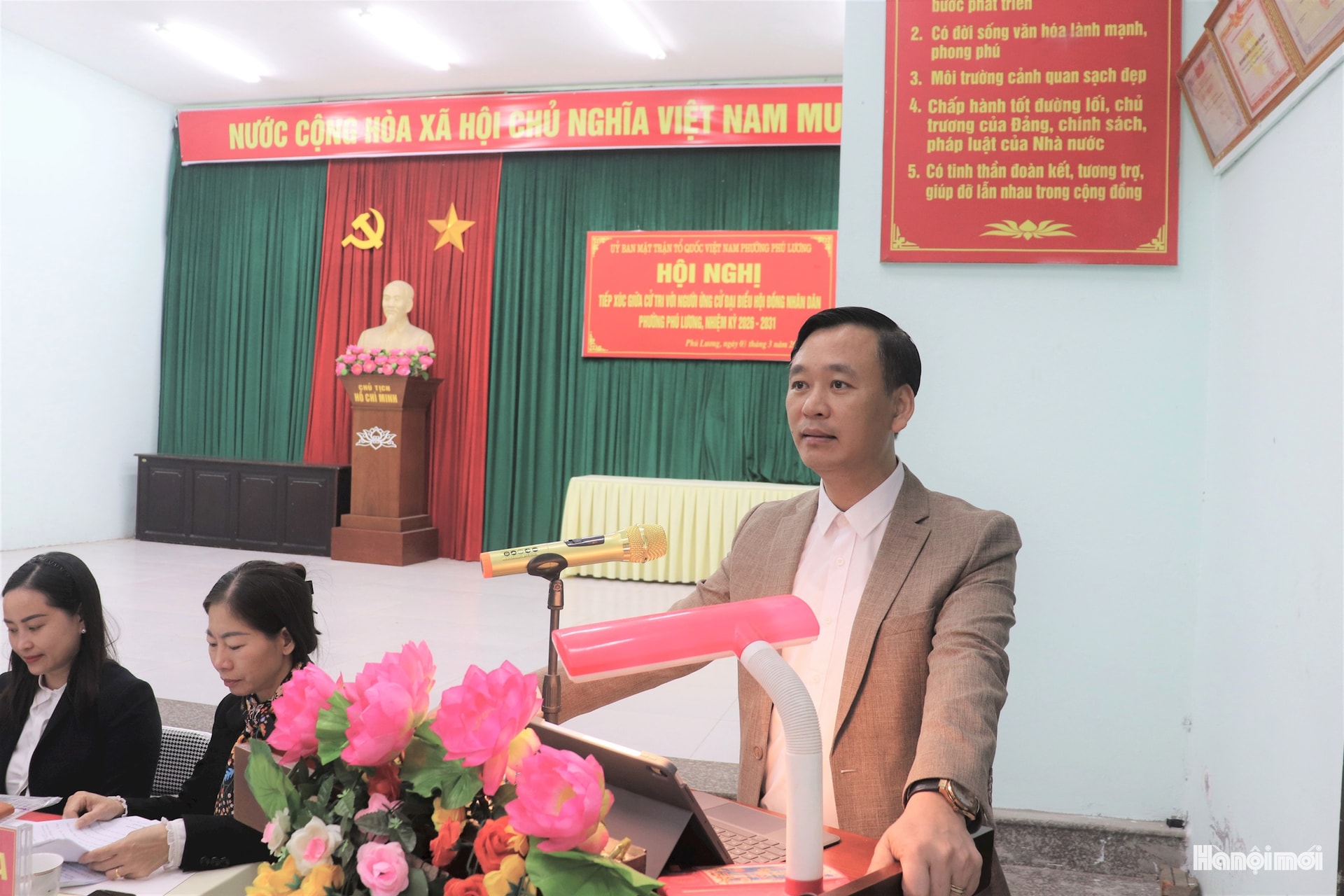 Đồng chí Lương Mạnh Sơn, Bí thư Đảng ủy, Chủ tịch HĐND phường Phú Lương, một trong 8 ứng cử viên đại biểu HĐND phường trình bày chương trình hành động tại hội nghị tiếp xúc cử tri. Ảnh: PV