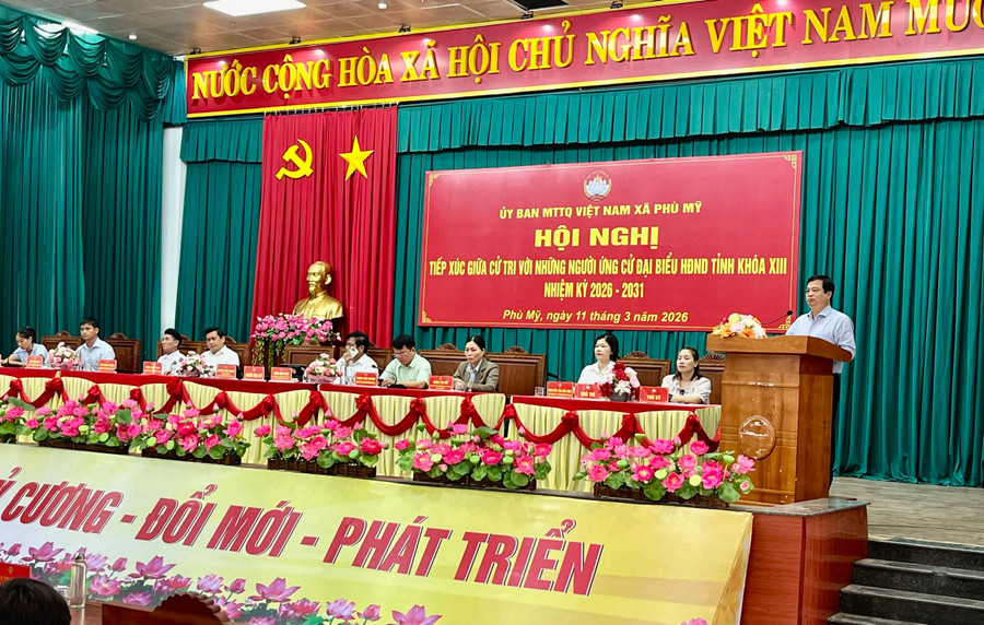 Ứng cử viên đại biểu HĐND tỉnh nhiệm kỳ 2026-2031 thuộc đơn vị bầu cử số 8 tiếp xúc cử tri xã Phù Mỹ. Ảnh: Trung Nghĩa