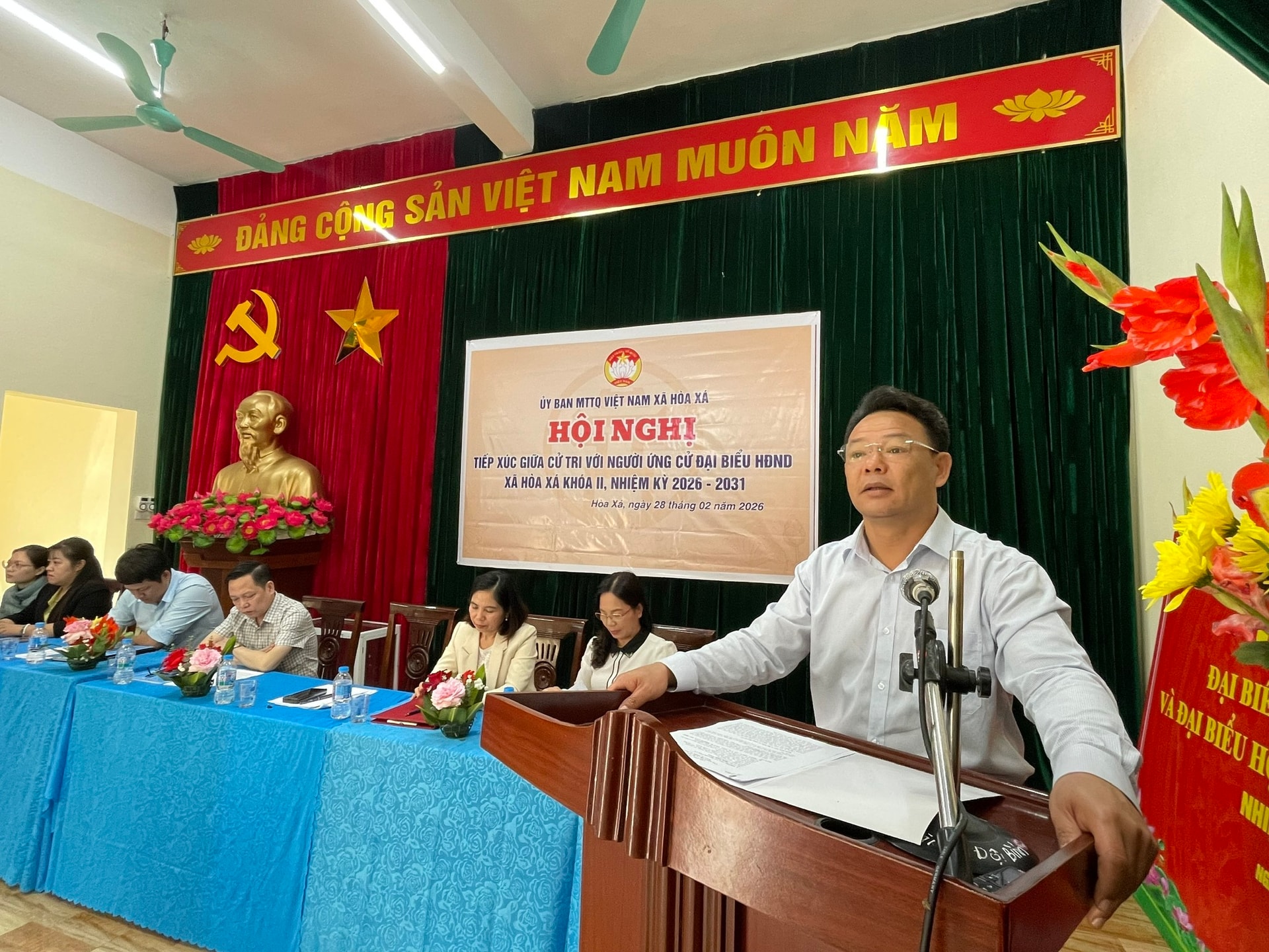 Trình bày Chương trình hành động của người ứng cử đại biểu HĐND xã Hòa Xá khóa II, Chủ tịch Ủy ban MTTQ Việt Nam xã Hòa Xá Đặng Đăng Khoa cam kết duy trì mối liên hệ chặt chẽ với nhân dân, thực hiện tốt việc tiếp xúc cử tri trước và sau kỳ họp; lắng nghe, tổng hợp, phản ánh trung thực các ý kiến, kiến nghị chính đáng, đồng thời theo dõi, giám sát việc giải quyết của cơ quan chức năng.