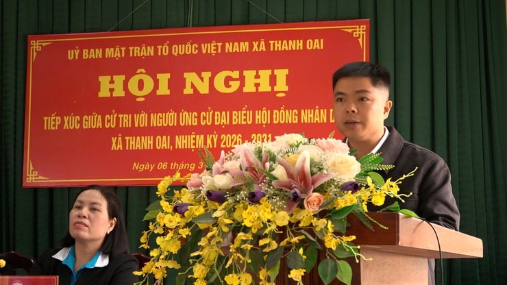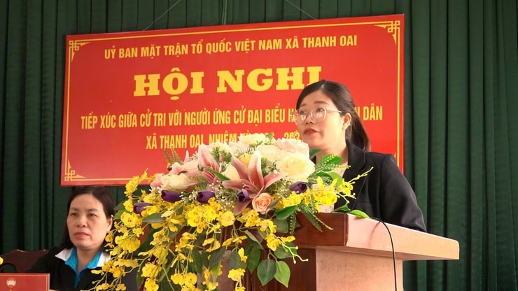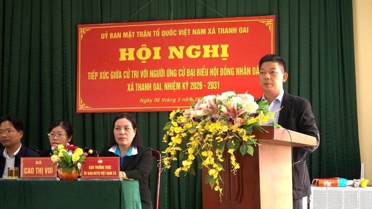 Các ứng cử đại biểu HĐND xã Thanh Oai nhiệm kỳ 2026-2031 - đơn vị bầu cử số 1 trình bày chương trình hành động. Ảnh: Phong Đỗ
