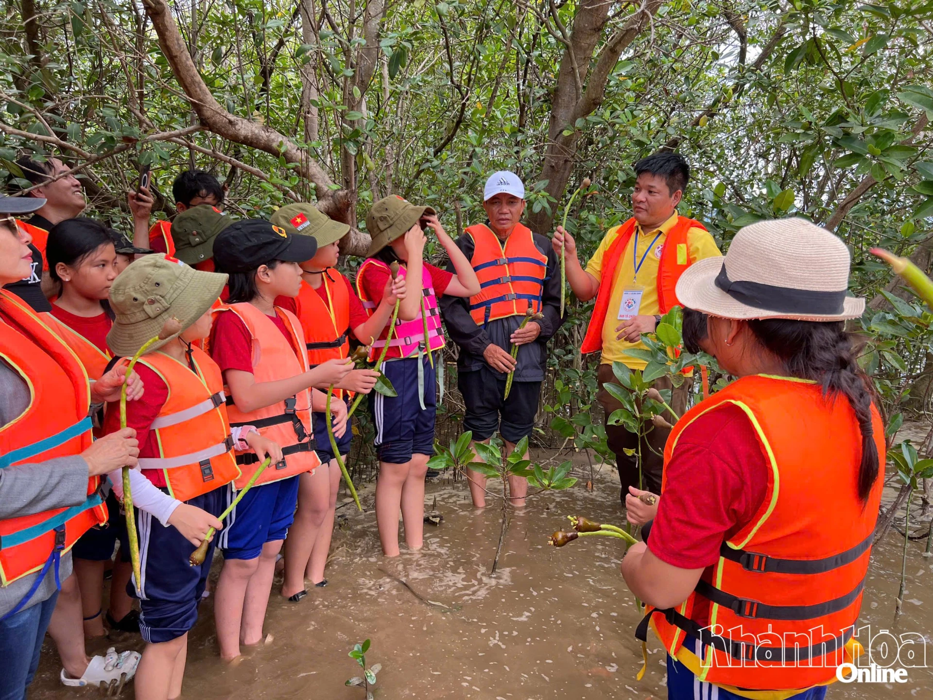 Học sinh tập trung lắng nghe cách trồng cây đước.