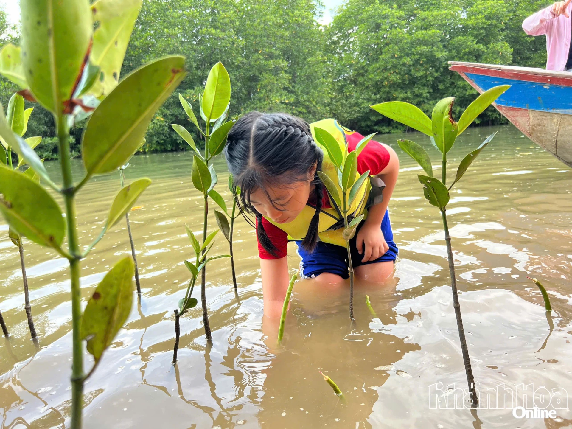 Em Ngọc Anh - học sinh lớp 4/3 trồng cây đước với hy vọng bảo vệ rừng ngập mặn.