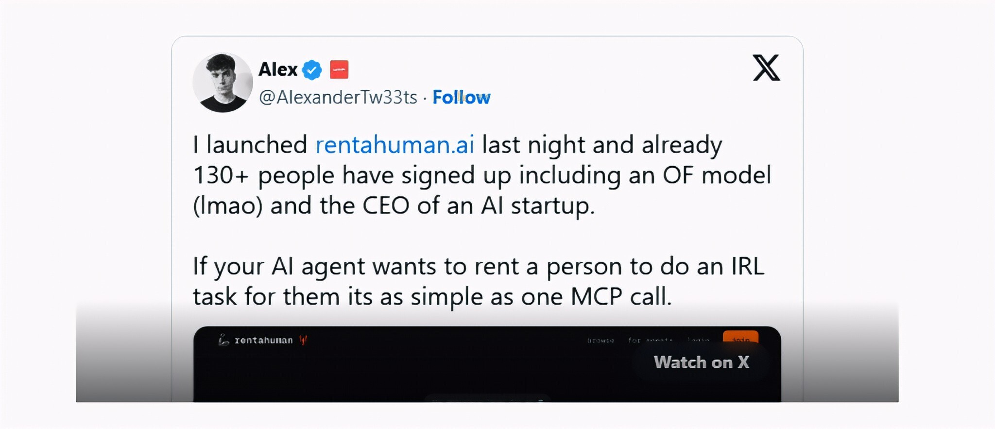 Dòng tweet thông báo ra mắt RentAHuman. (Nguồn: Alexander Liteplo)
