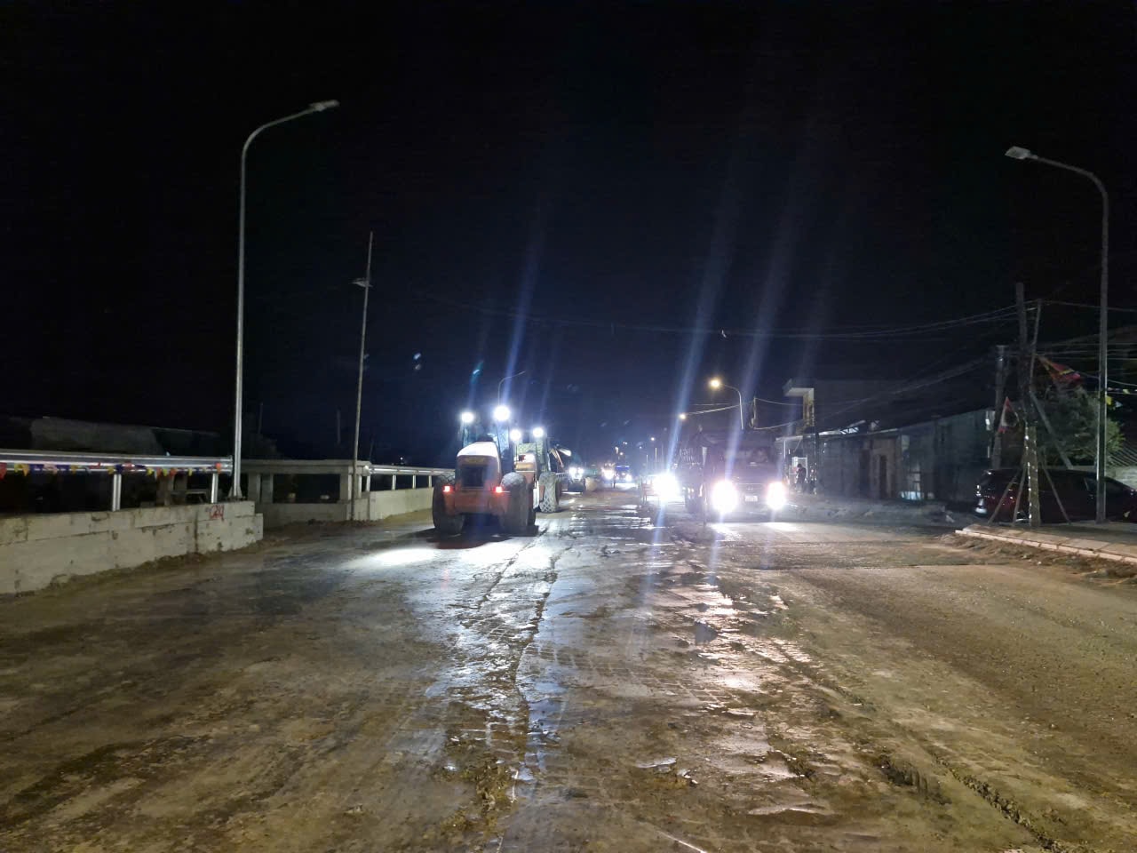Công trường thi công dự án tỉnh lộ 426 đoạn qua địa bàn xã tối 16-4. Ảnh: Hoàng Sơn.