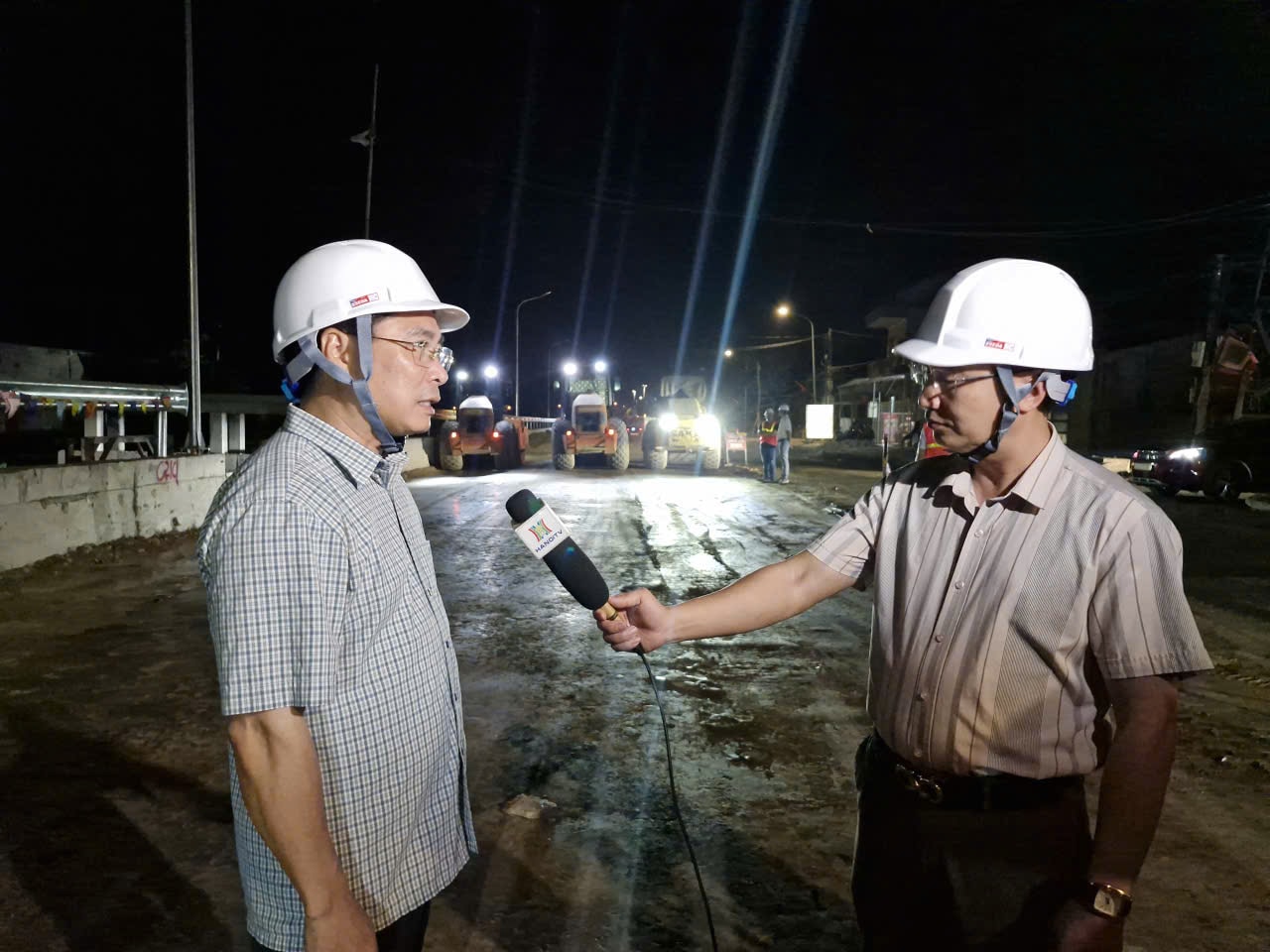 Ông Nguyễn Huy Minh - Phó Giám đốc Công ty cổ phần xây dựng cầu đường Hà Nội trao đổi với phóng viên Cơ quan Báo và Phát thanh, Truyền hình Hà Nội tại công trường thi công dự án tỉnh lộ 426 đoạn qua địa bàn xã, tối 16-4 . Ảnh: Hoàng Sơn.
