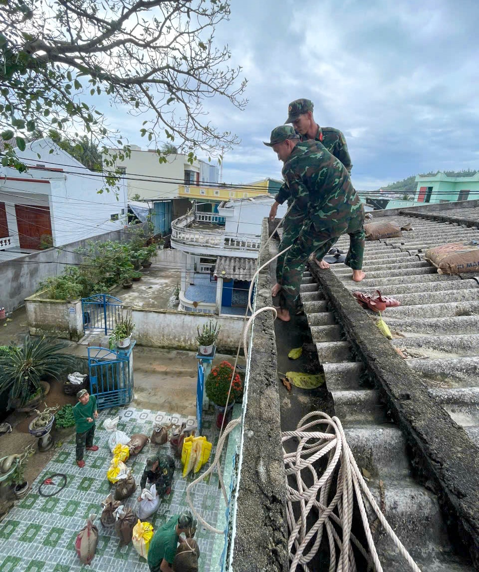 Lực lượng chức năng hỗ trợ người dân tại Đặc khu Lý Sơn chằn chống nhà cửa trước khi bão số 13 đổ bộ.