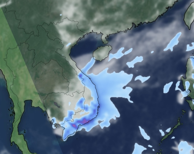 Ảnh radar thời tiết lúc 17 giờ 44 ngày 3-12 cho thấy Trung Trung bộ và Nam Trung bộ có mưa. Nguồn: Z.E