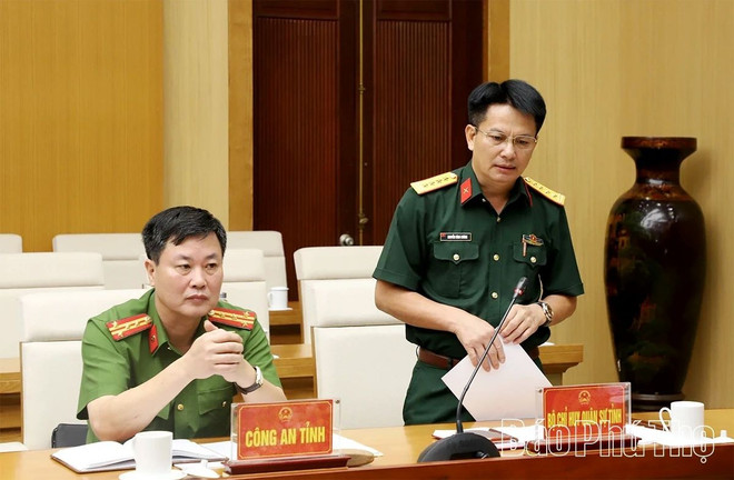 Đại tá Nguyễn Đình Cương báo cáo công tác triển khai lực lượng, phối hợp với các xã, phường ứng phó, khắc phục hậu quả mưa lũ trên địa bàn tỉnh của lực lượng vũ trang. (Ảnh: Nguồn Báo Phú Thọ)
