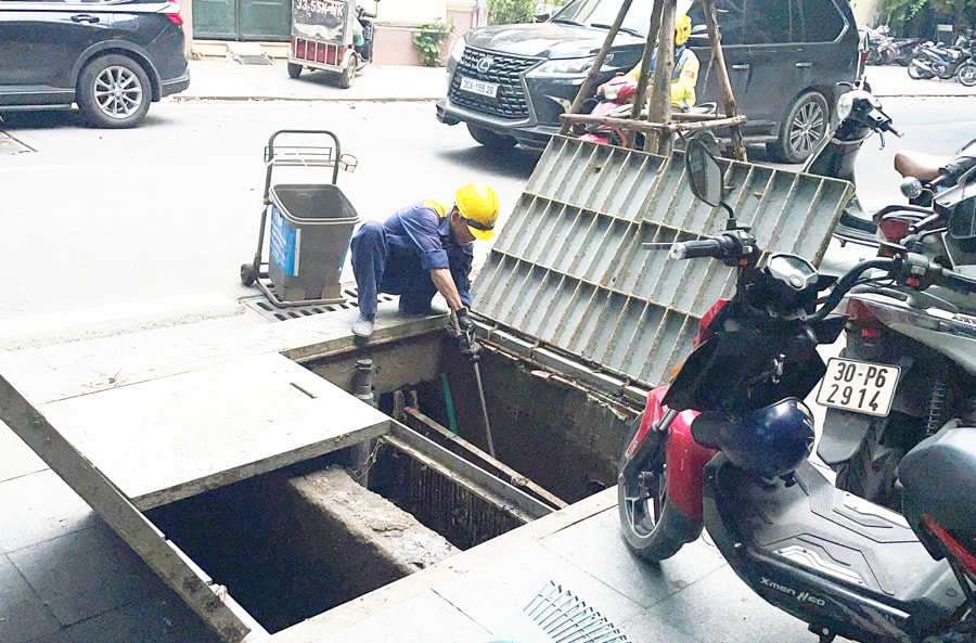 Công nhân Xí nghiệp Thoát nước số 4 (Công ty TNHH một thành viên Thoát nước Hà Nội) vớt rác bể bơm của trạm bơm chìm trên phố Nguyễn Khuyến. Ảnh: Bảo Khánh