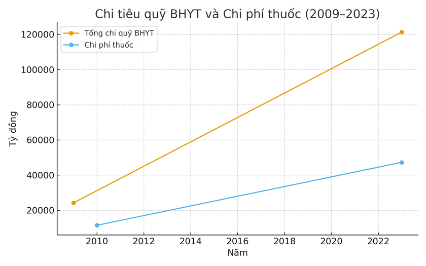 Với tỷ lệ bao phủ bảo hiểm y tế đạt 93,35% dân số (2023), quỹ bảo hiểm y tế đã chi 121.221 tỷ đồng, cao gấp 5 lần so với năm 2009. Thuốc chiếm 33,8% cơ cấu chi tiêu, tăng từ 11.500 tỷ đồng (2010) lên 47.230 tỷ đồng (2023). Nguồn: Bảo hiểm xã hội