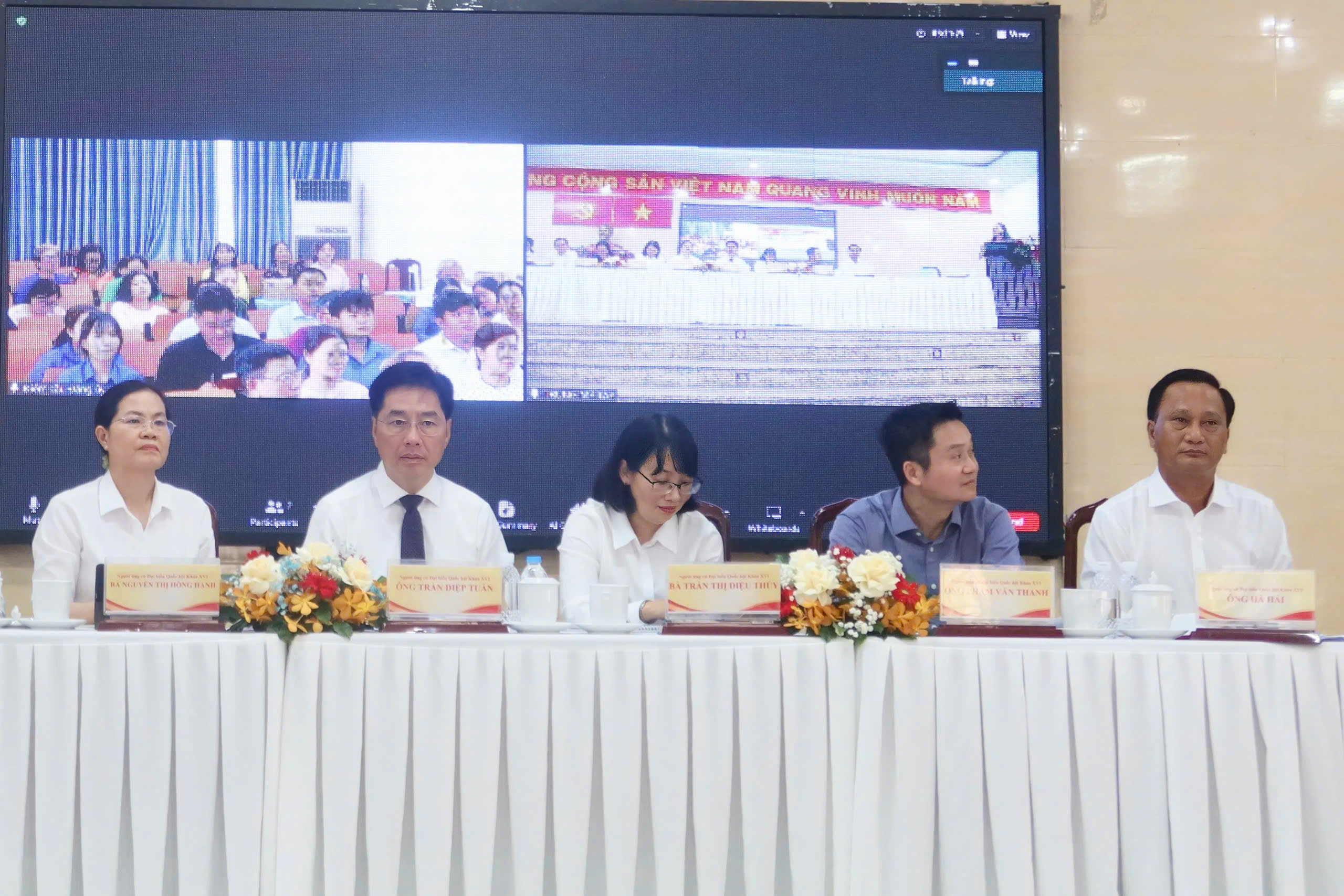 5 ứng cử viên ĐBQH khóa XVI tại tổ bầu cử số 10 đang lắng nghe ý kiến của cử tri qua điểm cầu Đảng ủy phường Trung Mỹ Tây. Ảnh: TRẦN MINH