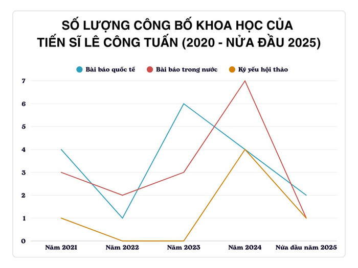 Số lượng công bố khoa học của Tiến sĩ Lê Công Tuấn giai đoạn từ năm 2021 đến nửa đầu năm 2025. Biểu đồ: Gia Hân