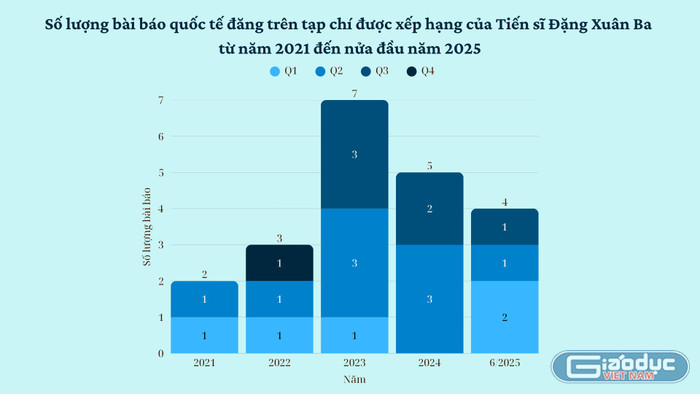 Thống kê số lượng bài báo quốc tế đăng trên tạp chí được xếp hạng của Tiến sĩ Đặng Xuân Ba từ năm 2021 đến 6/2025. Ảnh: Thanh Hà.