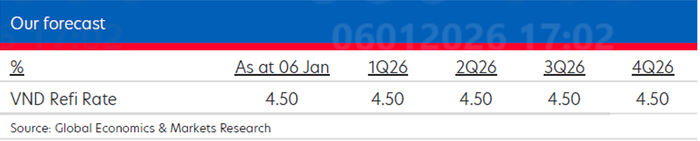 Trên cơ sở các yếu tố trên, ngân UOB dự đoán nhiều khả năng NHNN sẽ tiếp tục giữ nguyên lãi suất tái cấp vốn ở mức 4,5% trong suốt năm 2026.