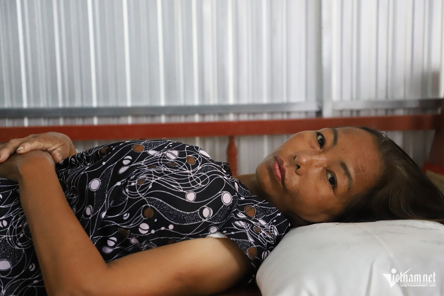 Bà Hồng tựa lưng vào con, thân hình tiều tụy sau những cơn đau triền miên. Thi thoảng, bà lại khẽ nhăn mặt, than đau nhức khắp người, giọng yếu ớt chìm trong tiếng mưa rơi trên mái tôn.