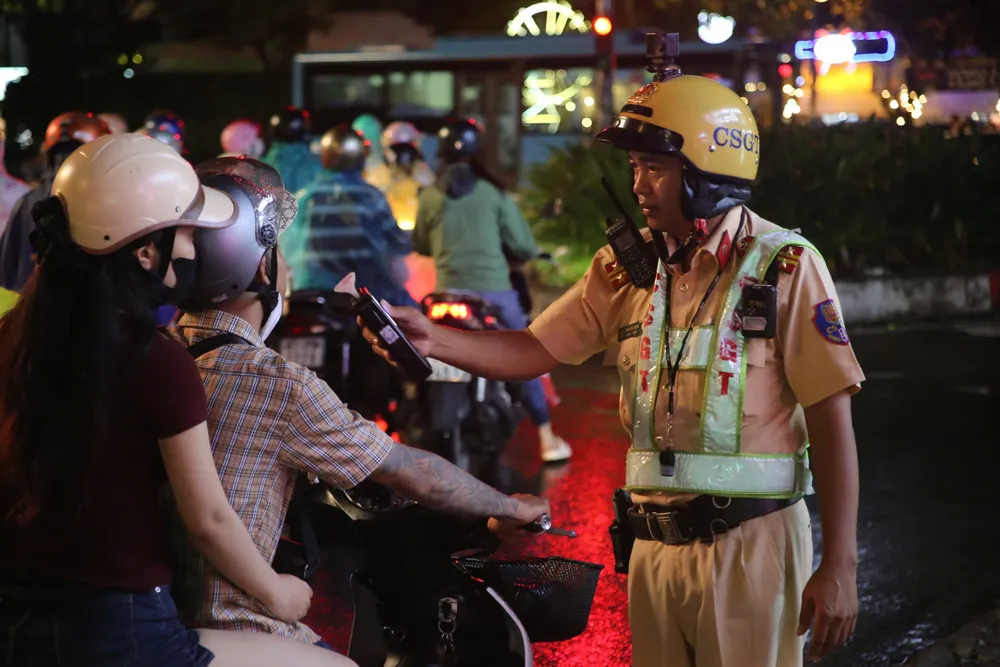 Lực lượng CSGT TP.HCM kiểm tra nồng độ cồn đối với các tài xế tham gia giao thông trong tối 20-10 nhằm đảm bảo an toàn và ngăn ngừa tai nạn giao thông. Ảnh: PHẠM HẢI