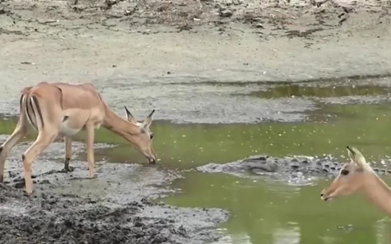 Theo đoạn clip ghi lại, một con linh dương đang cúi xuống uống nước tại một đầm lầy thì bất ngờ trở thành mục tiêu của cá sấu. Từ dưới làn nước đục, kẻ săn mồi âm thầm tiếp cận, di chuyển chậm rãi để không gây tiếng động.