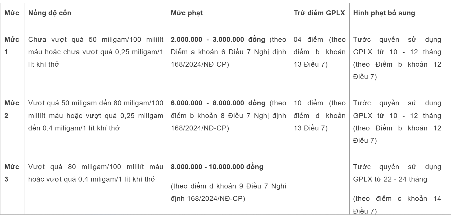 Cụ thể, theo Nghị định 168/2024/NĐ-CP thì hành vi điều khiển xe trên đường mà trong máu hoặc hơi thở có nồng độ cồn thì tùy tính chất, mức độ có thể bị xử phạt với các biện pháp và mức độ khác nhau.