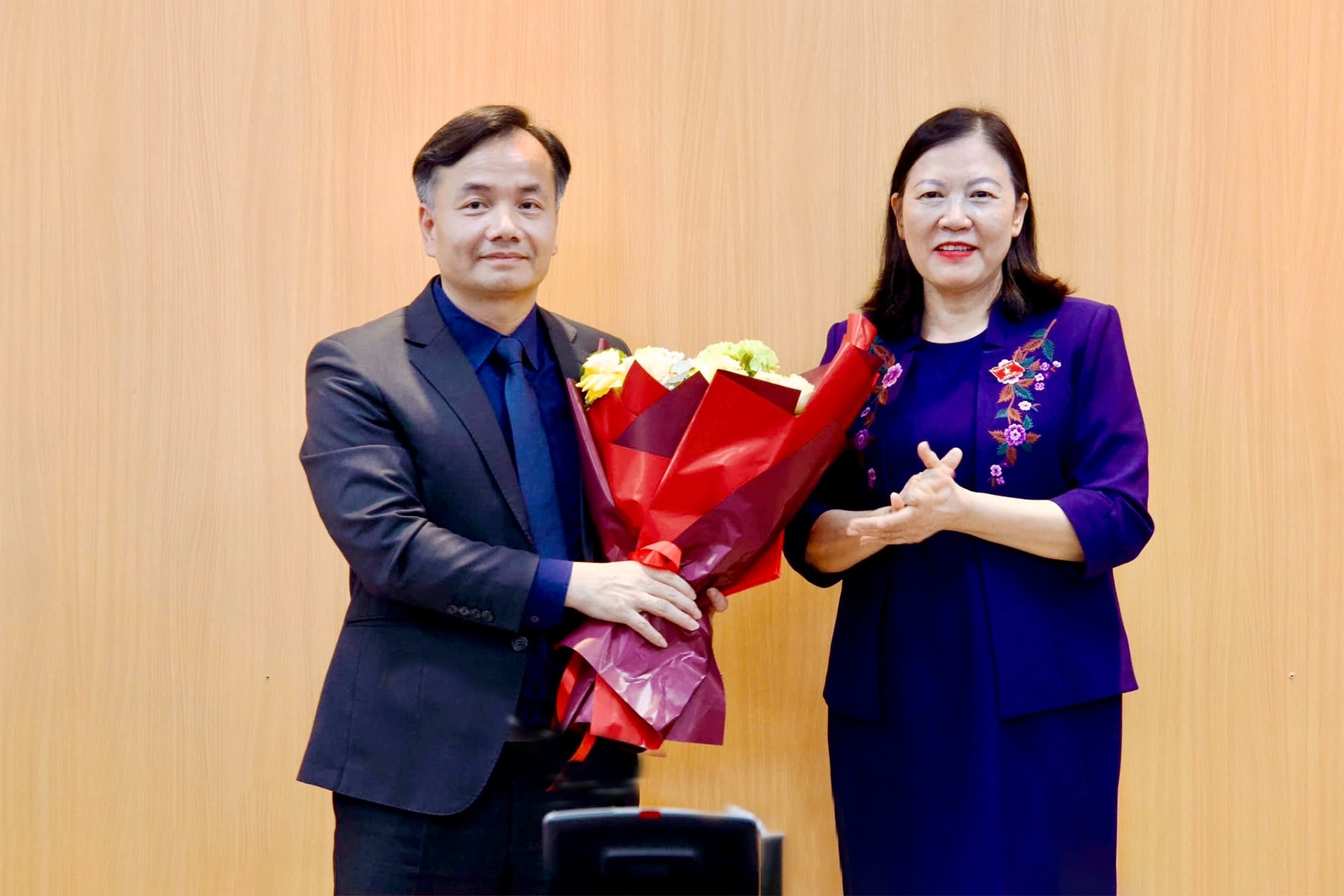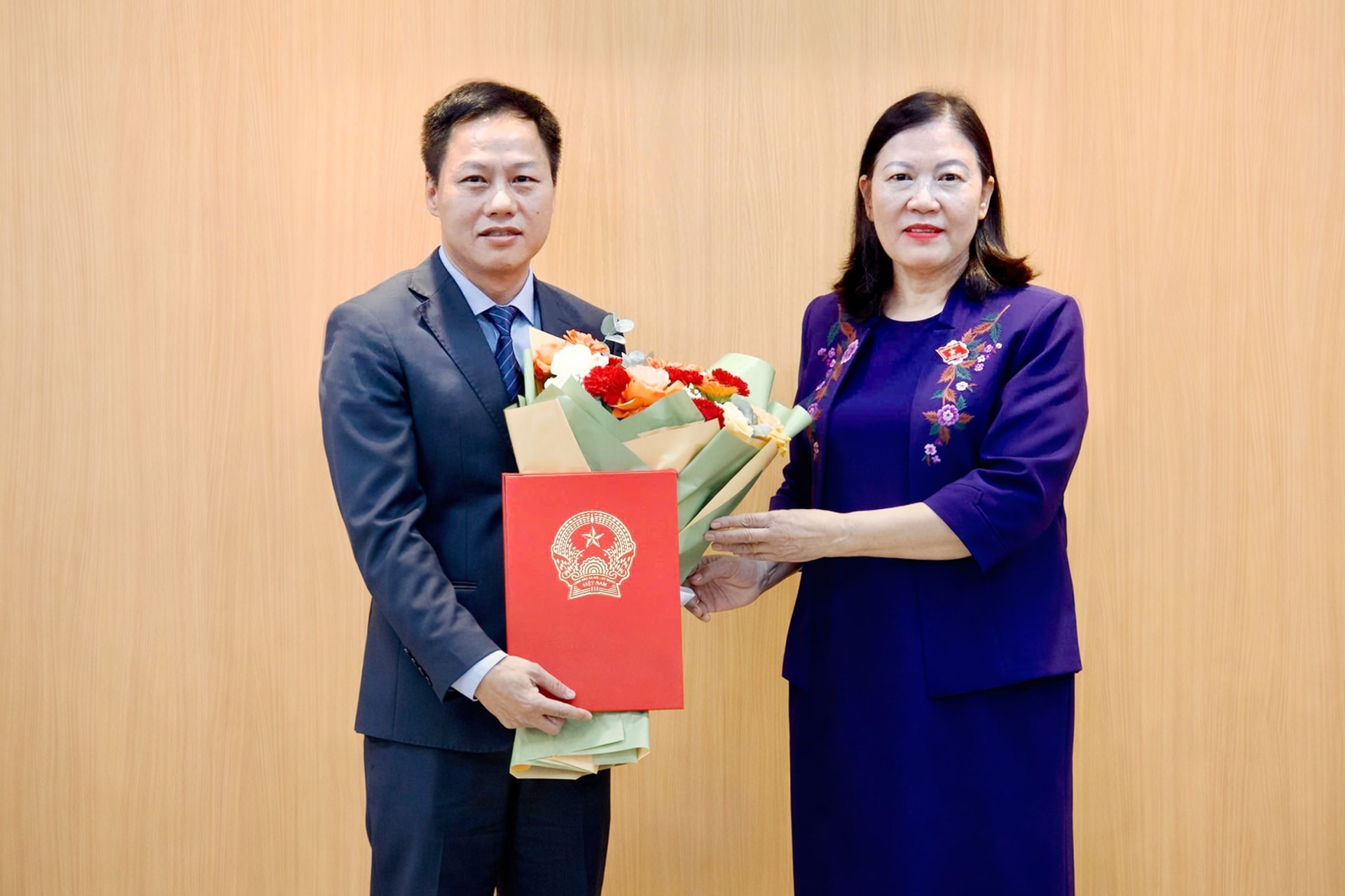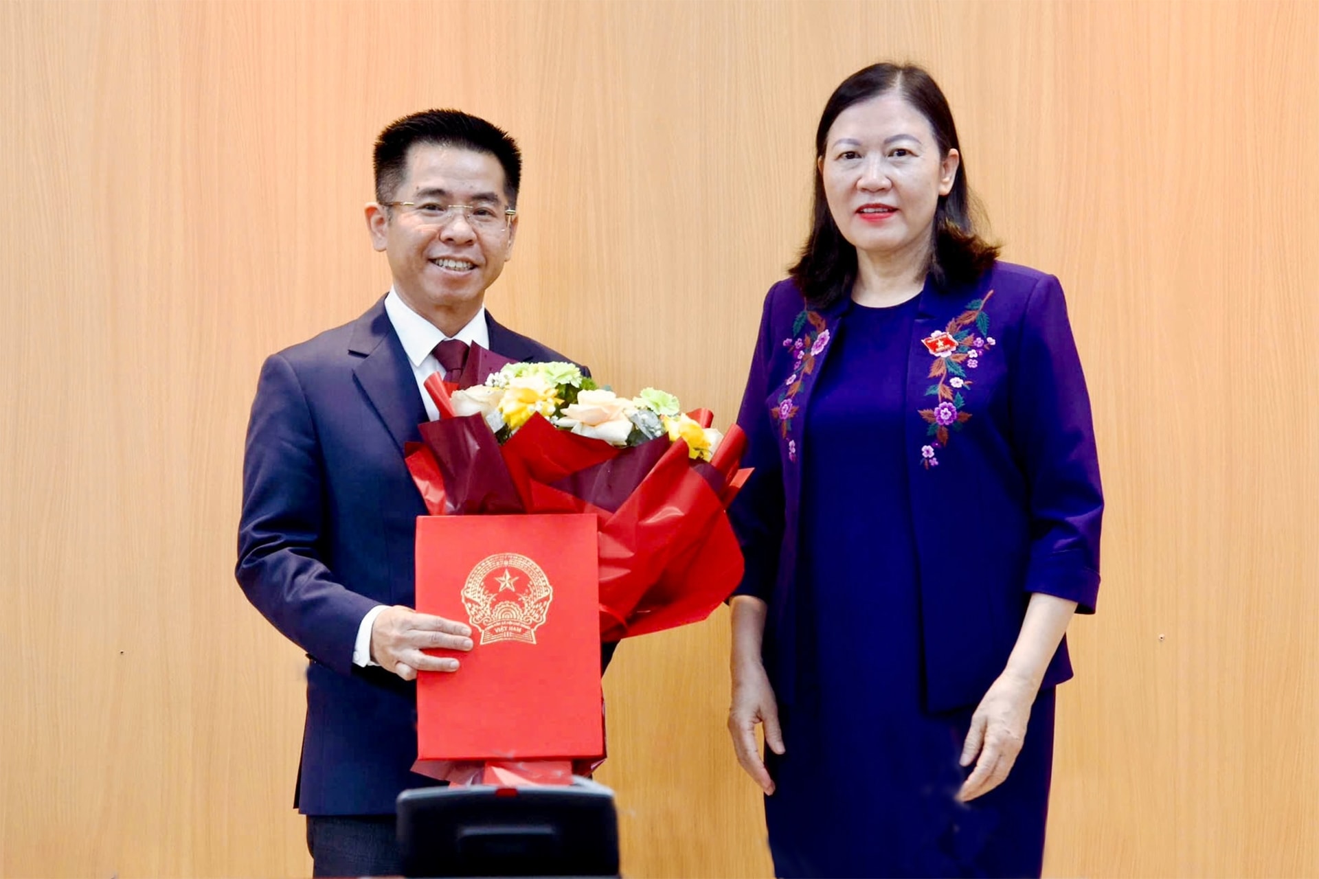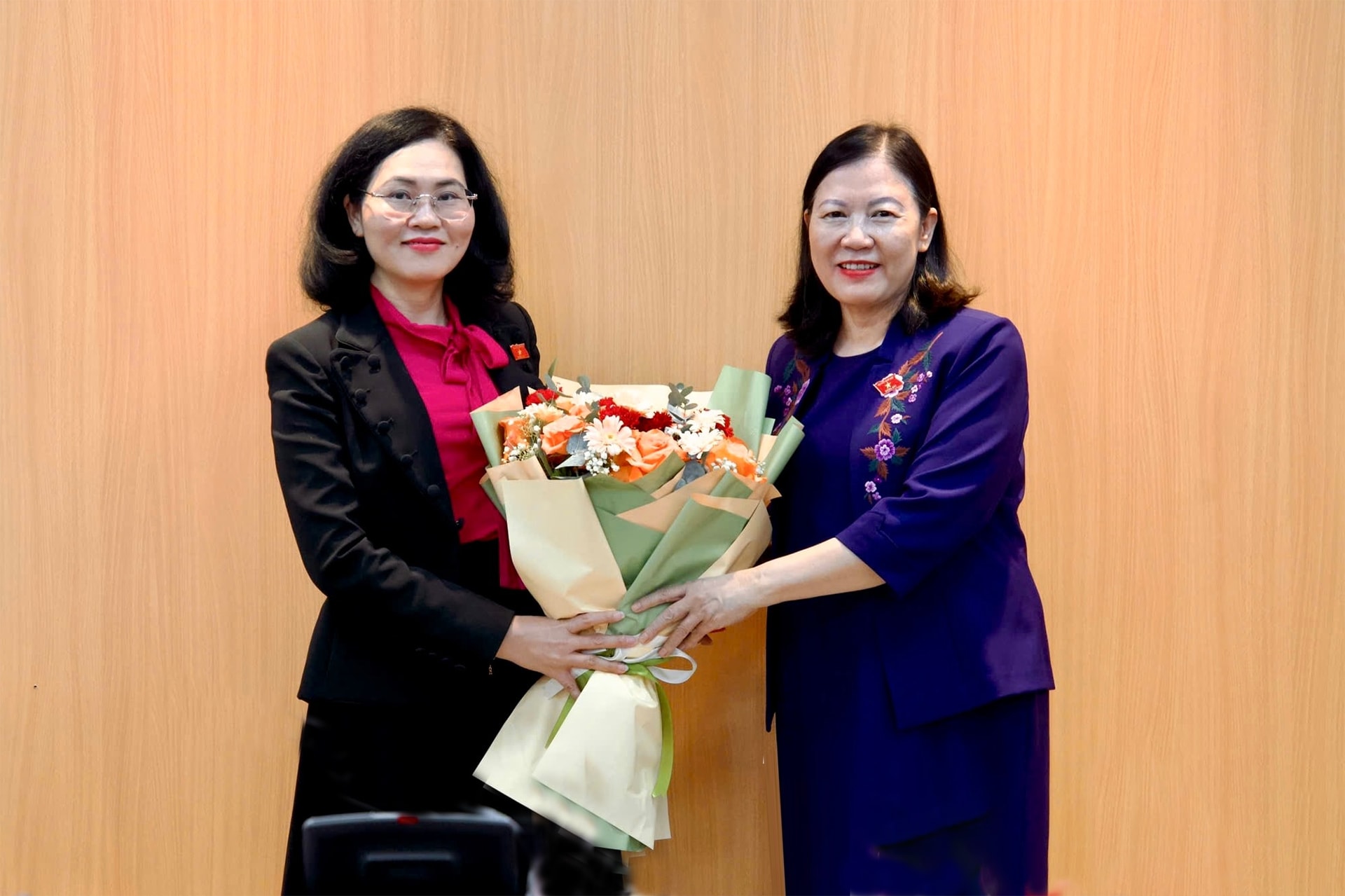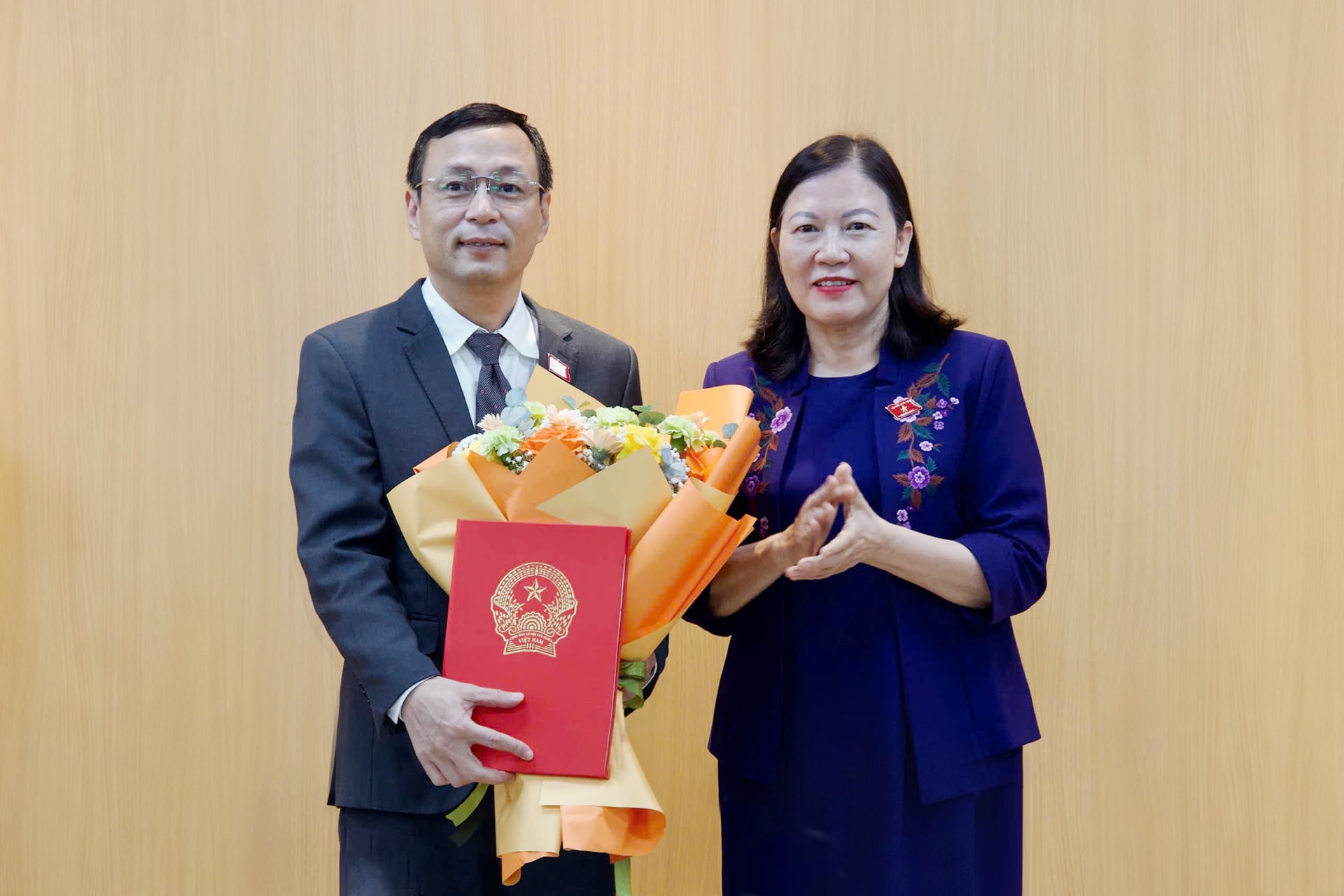 Chủ nhiệm Ủy ban Dân nguyện và Giám sát Lê Thị Nga chúc mừng ĐBQH Trần Hoài Nam (Cà Mau) được phê chuẩn chức danh Ủy viên là đại biểu Quốc hội hoạt động chuyên trách tại Ủy ban Dân nguyện và Giám sát khóa XVI