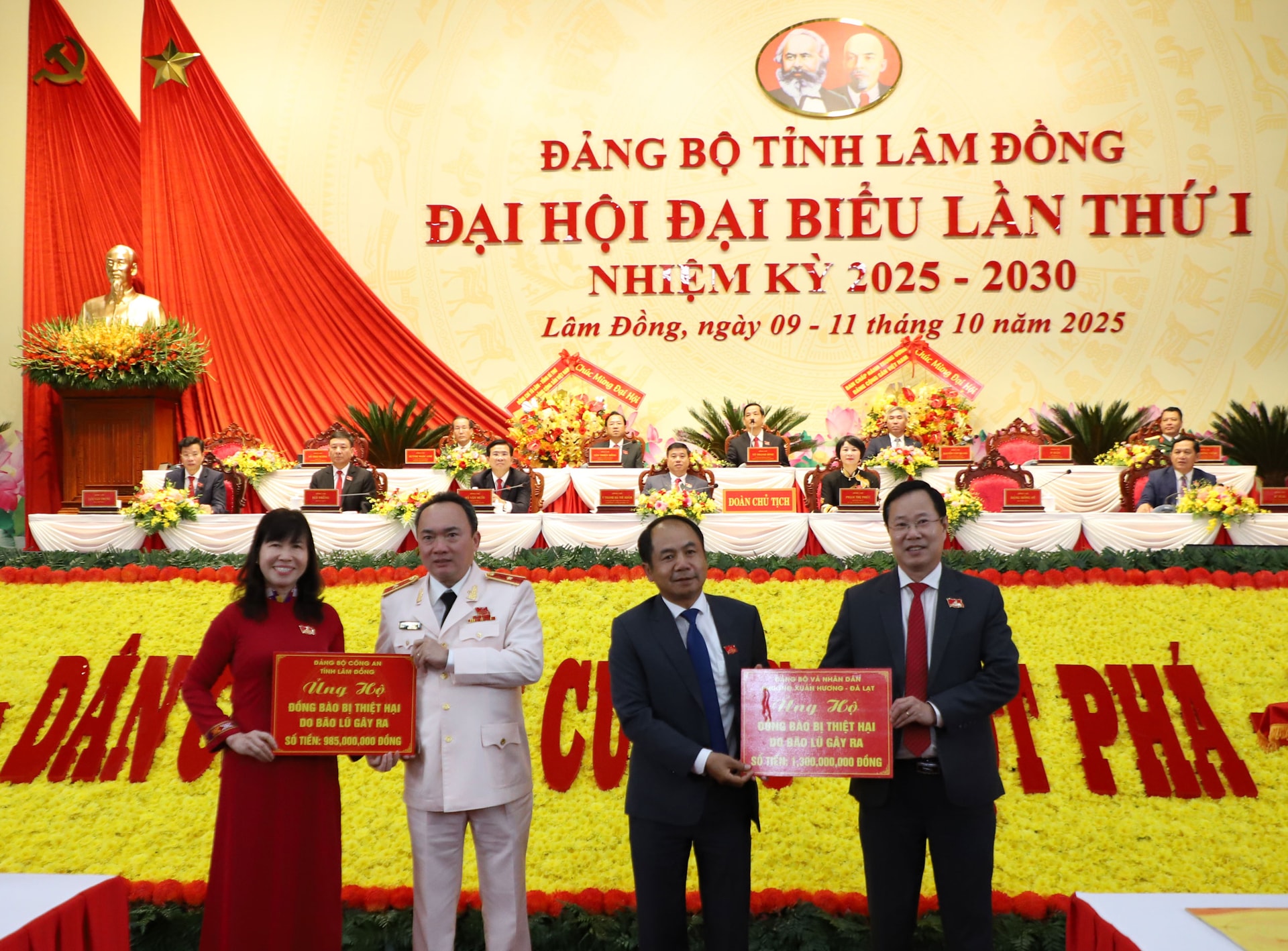 Đảng bộ Công an tỉnh Lâm Đồng và Đảng bộ và Nhân dân Phường Xuân Hương - Đà Lạt trao bảng tượng trưng ủng hộ đồng bào phía Bắc bị bão lũ