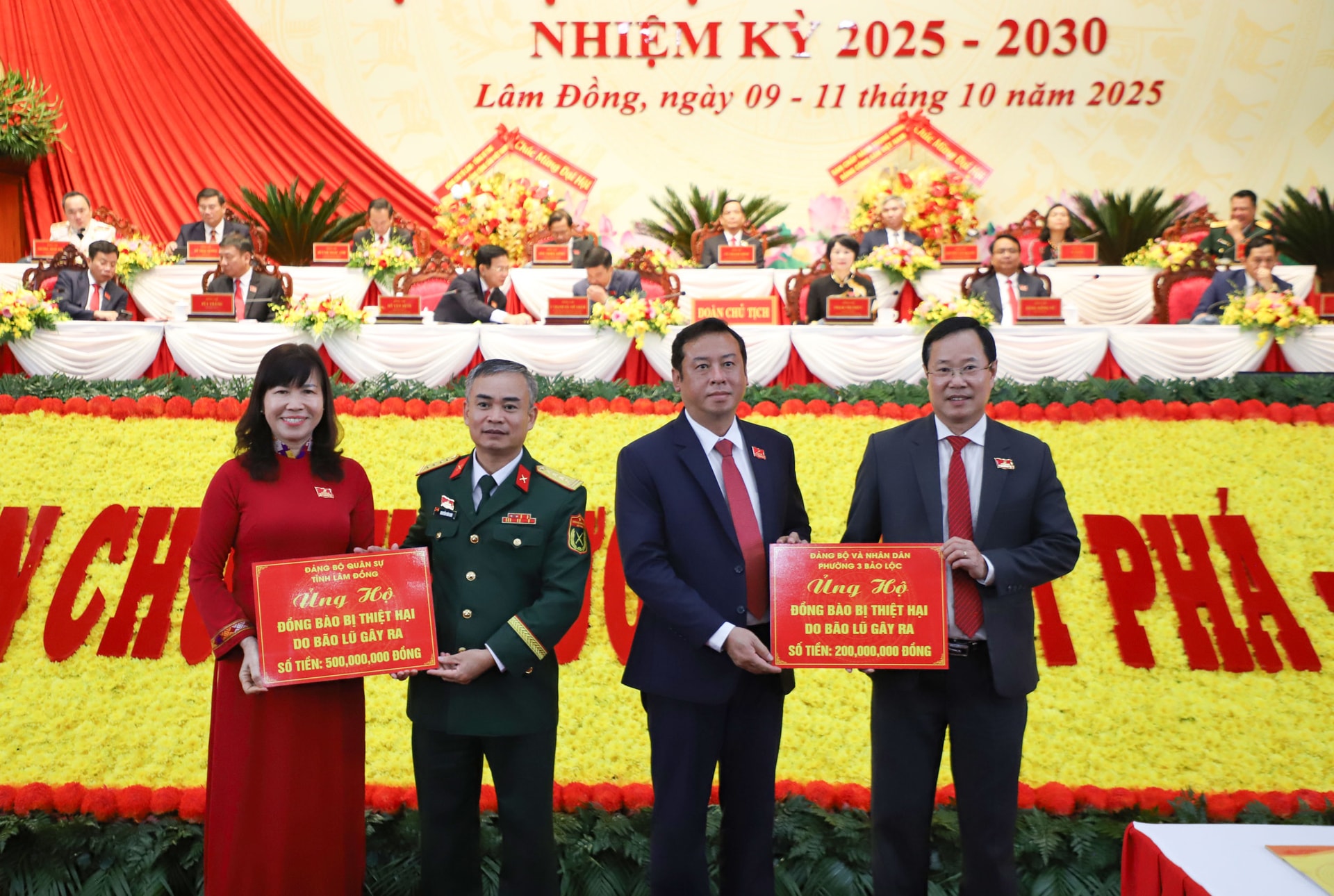 Đảng bộ Bộ chỉ huy Quân sự và Đảng bộ, Nhân dân Phường 3 Bảo Lộc trao bảng tượng trưng ủng hộ đồng bào bị ảnh hưởng bởi bão lụt