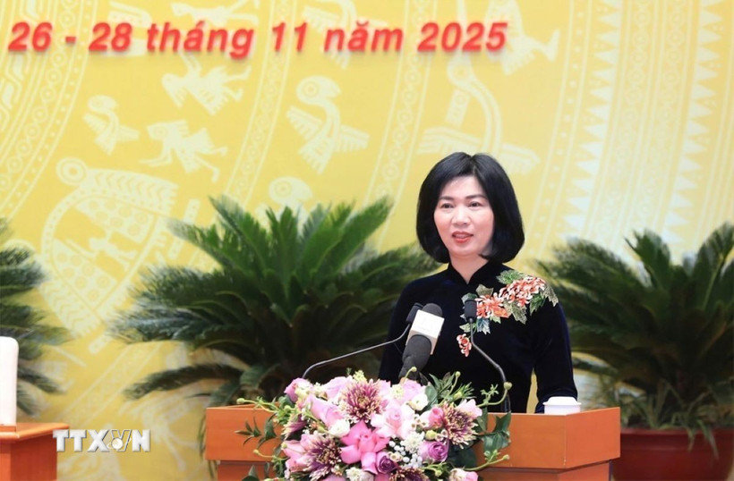 Chủ tịch Hội đồng nhân dân thành phố Hà Nội Phùng Thị Hồng Hà phát biểu. (Ảnh: Minh Đức/TTXVN)