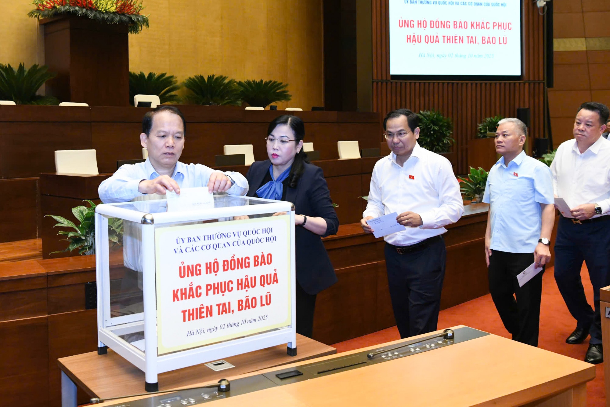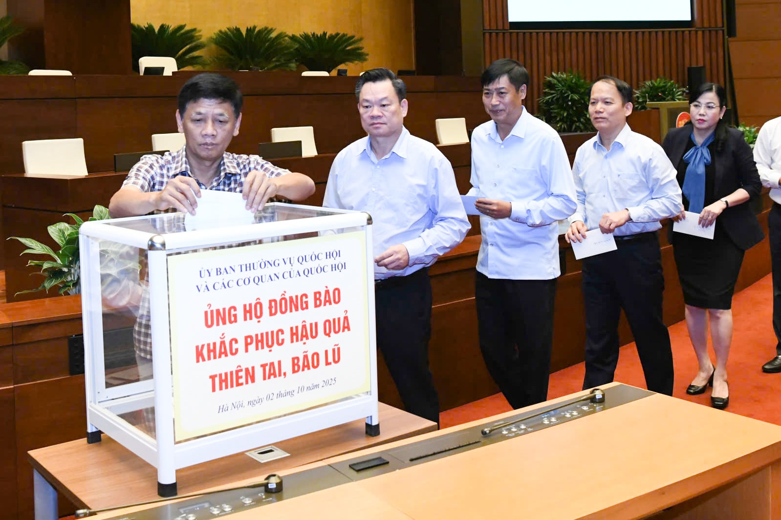 Chủ nhiệm Ủy ban Pháp luật và Tư pháp Hoàng Thanh Tùng và các đại biểu ủng hộ đồng bào khắc phục hậu quả thiên tai, bão lũ