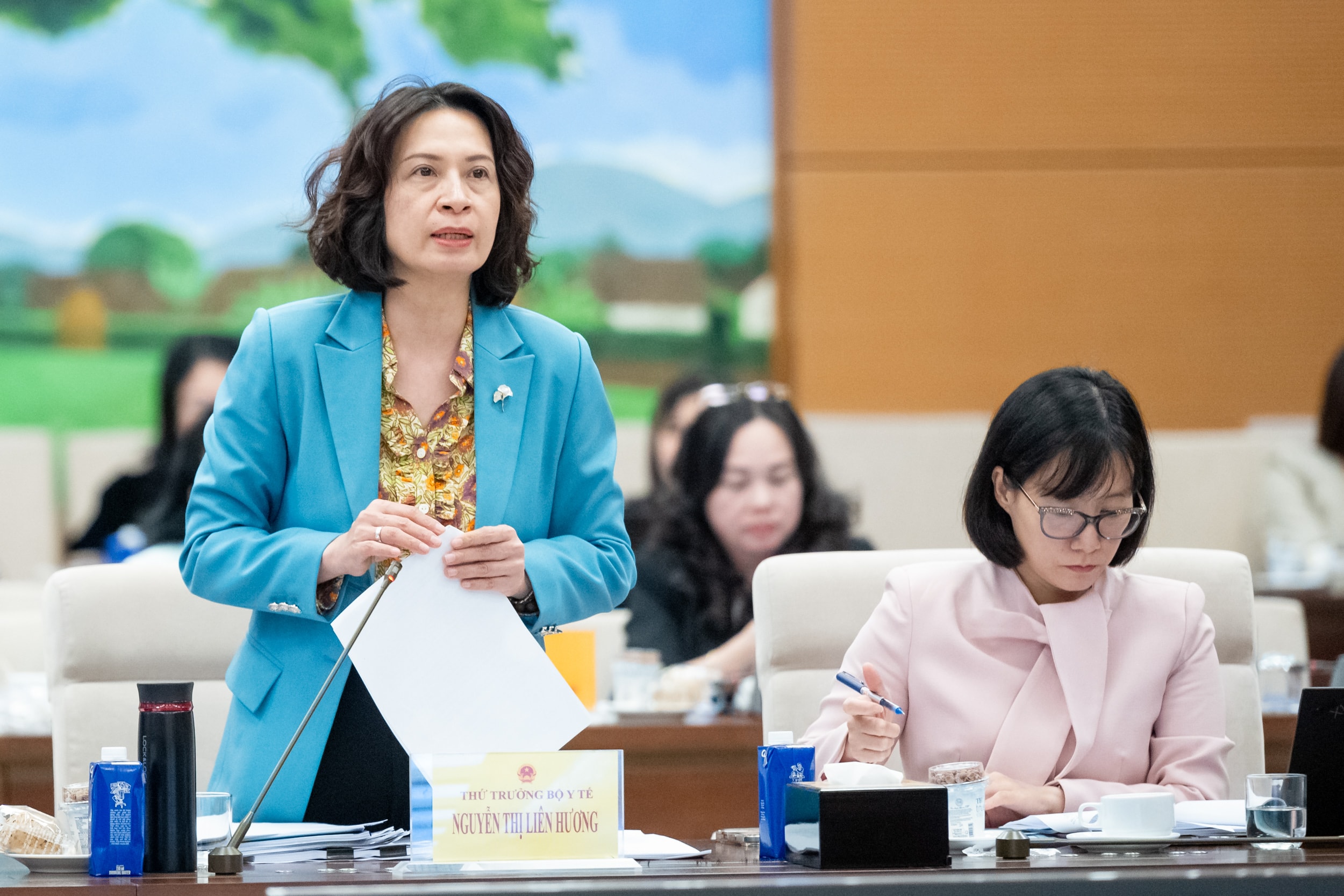 Thứ trưởng Bộ Y tế Nguyễn Thị Liên Hương trình bày các nhóm chính sách được đề xuất trong dự thảo Nghị quyết về một số cơ chế, chính sách đột phá cho công tác bảo vệ, chăm sóc và nâng cao sức khỏe nhân dân. Ảnh: Phạm Thắng
