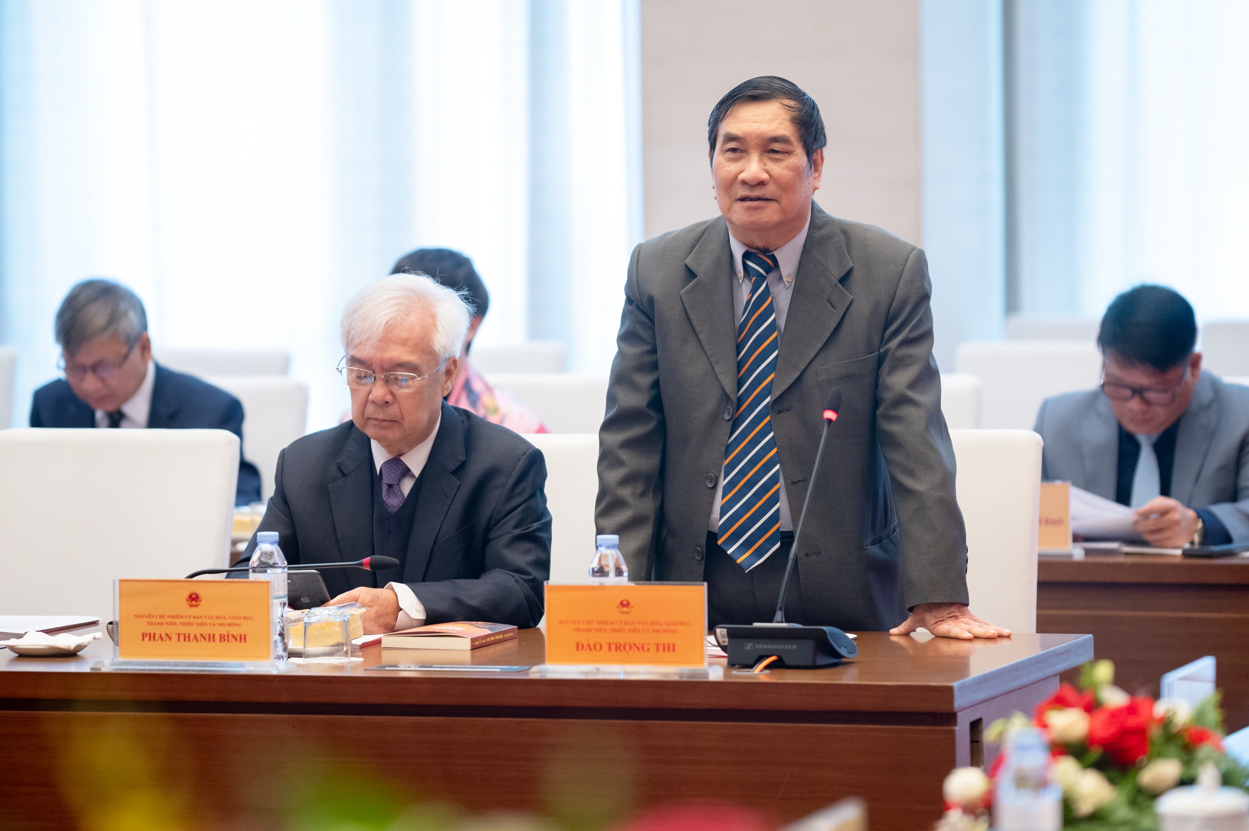 GS.TS.VS. Đào Trọng Thi, nguyên Chủ nhiệm Ủy ban Văn hóa, Giáo dục, Thanh niên, Thiếu niên và Nhi đồng bày tỏ vui mừng trước những thành tựu lập pháp và các chính sách lớn trong lĩnh vực giáo dục - đào tạo nhiệm kỳ Khóa XV. Ảnh: Phạm Thắng