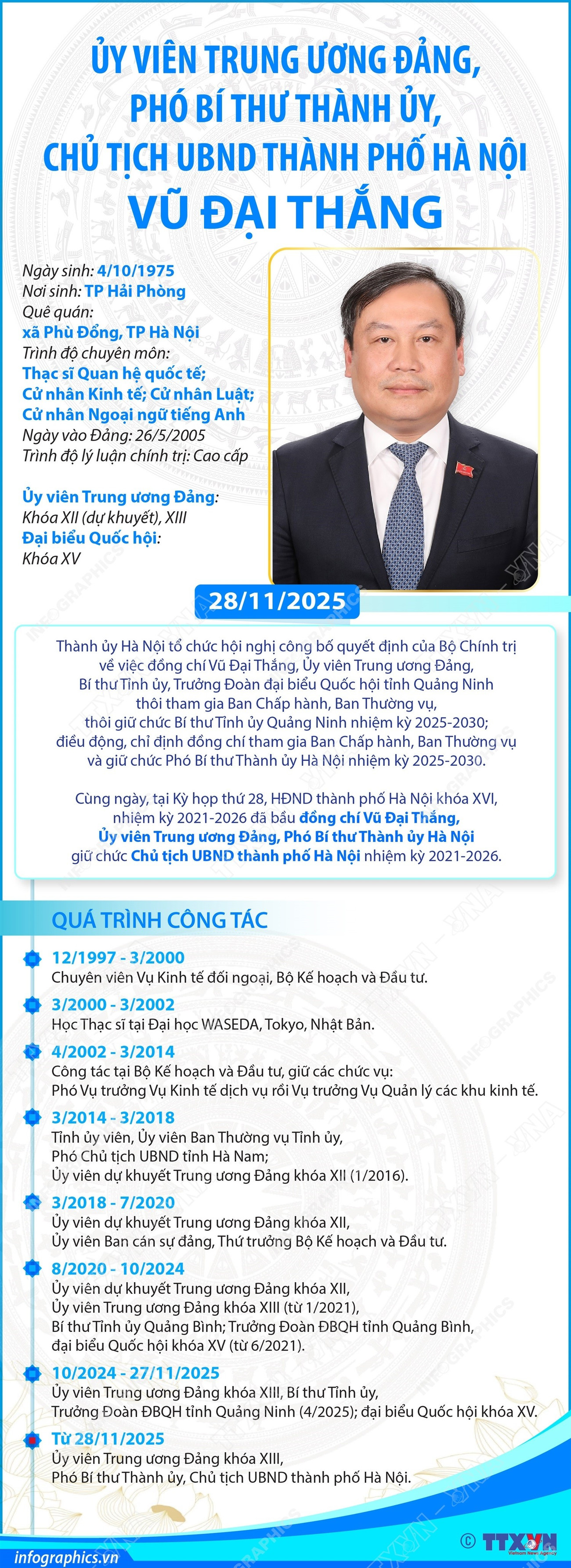 Ngày 28/11, Thành ủy Hà Nội tổ chức hội nghị công bố quyết định của Bộ Chính trị về việc ông Vũ Đại Thắng, Ủy viên Trung ương Đảng, Bí thư Tỉnh ủy, Trưởng Đoàn đại biểu Quốc hội tỉnh Quảng Ninh thôi tham gia Ban Chấp hành, Ban Thường vụ, thôi giữ chức Bí thư Tỉnh ủy Quảng Ninh nhiệm kỳ 2025-2030; điều động, chỉ định ông tham gia Ban Chấp hành, Ban Thường vụ và giữ chức Phó Bí thư Thành ủy Hà Nội nhiệm kỳ 2025-2030.