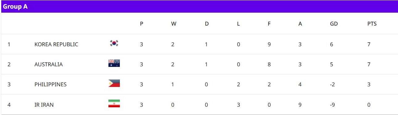Philippines xếp thứ 3 có 3 điểm và hiệu số -2 nhưng ghi chỉ 2 bàn.