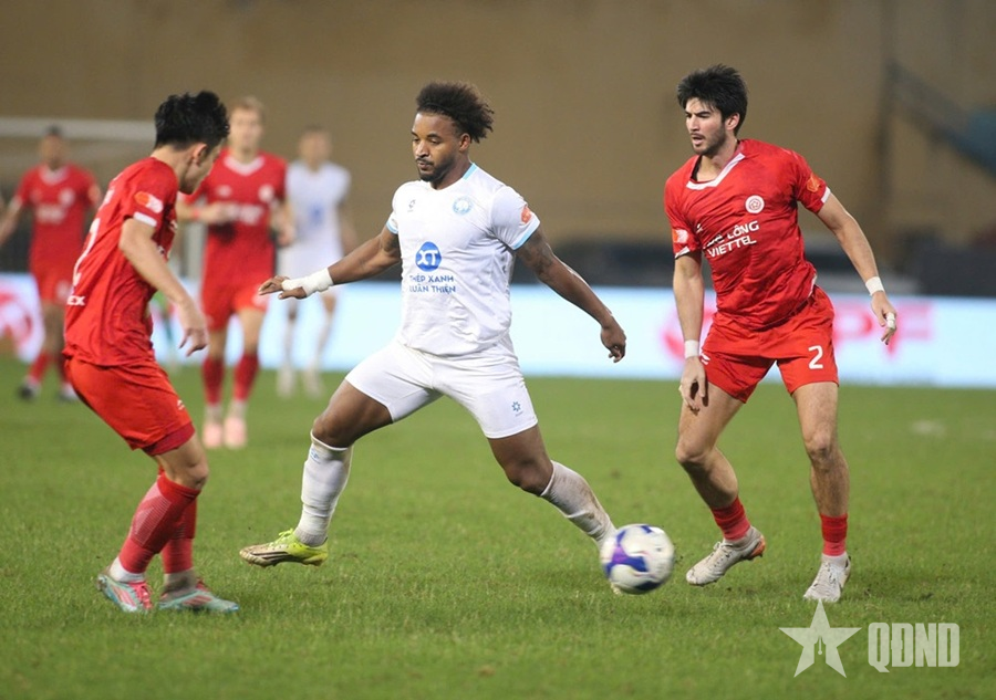 Xuân Son (giữa) trong vòng vây hàng phòng ngự Thể Công-Viettel.