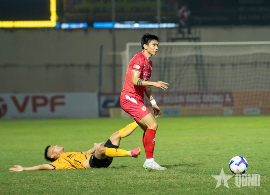 Văn Hậu trước tình huống sút xa ghi bàn cho Công an Hà Nội FC.